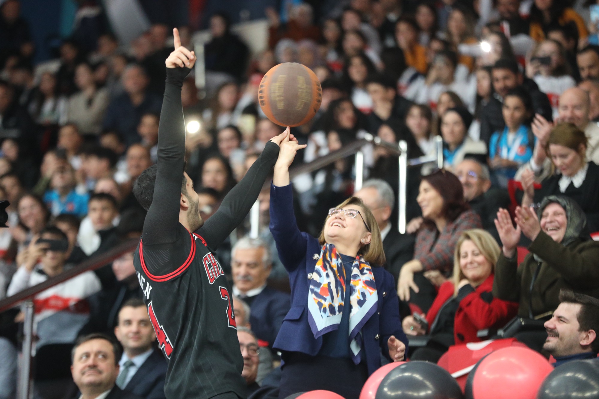 Basketbol gösterisinde, oyuncular Gaziantep Büyükşehir Belediye Başkanı’nı da dahil etti. Oyuncu basketbol topuyla Başkan Fatma Şahin’in yanına gelerek, selamlaştı ardından parmağında çevirdiği topu Şahin’in parmağına yerleştirdi.