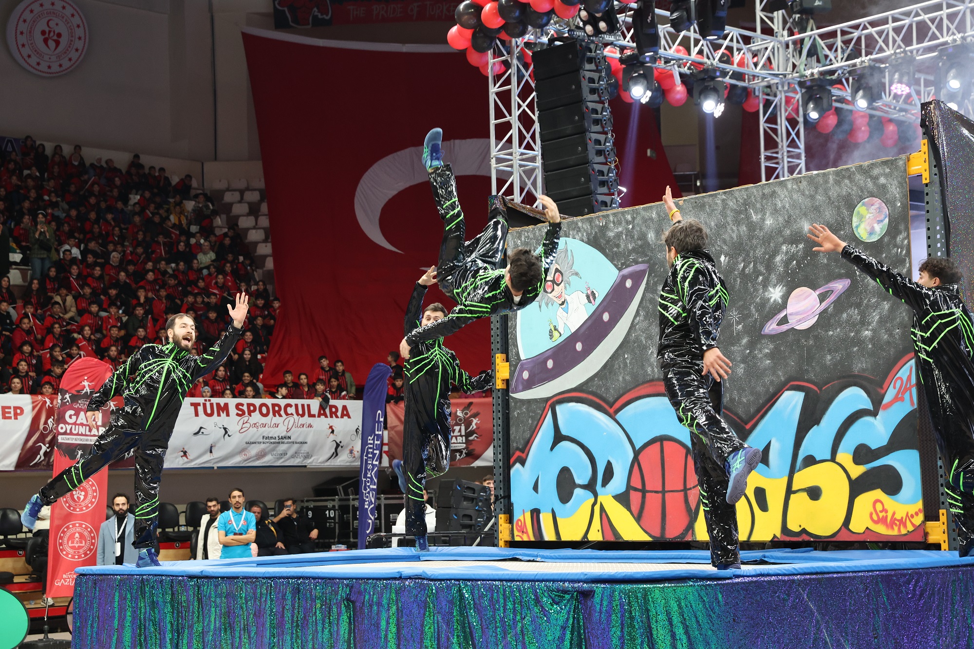 Protokol konuşmalarının ardından nefes kesen gösterilerle program devam etti. İlk olarak minikler kata gösterisi yapıldı. Devamında akrobasi ve basketbol showlarıyla nefes kesen performanslar sergilendi.