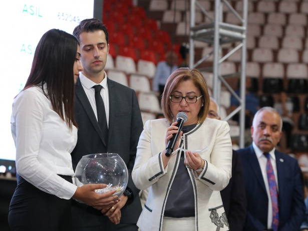 Kura çekimi için Karataş Spor Salonu’nda bir tören düzenlendi. Törende katılımcılara açıklamalarda bulunan Gaziantep Büyükşehir Belediye Başkanı Fatma Şahin, Gaziantep’te herkesin ev sahibi olmasını istediğini söyledi.