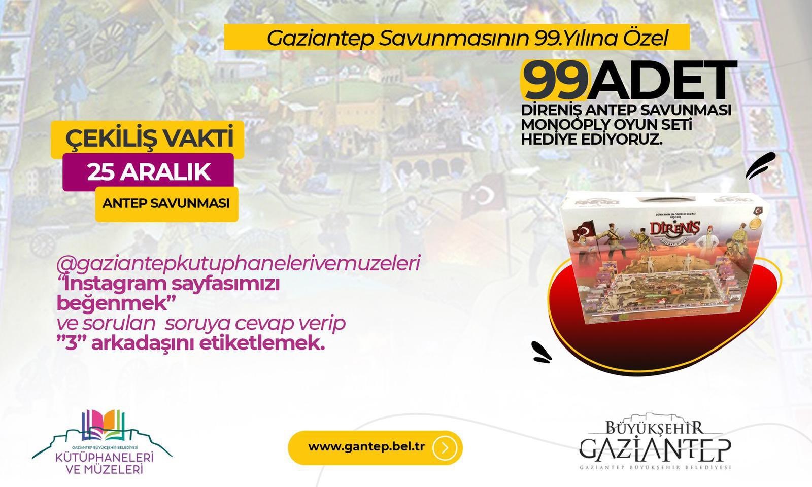 Gaziantep Büyükşehir Belediyesi’nin kurumsal sosyal medya hesaplarından Gaziantep Savunması’nın 99'uncu yılına özel düzenlediği 99 adet “Diriliş Antep Savunması Monopoly Oyun Seti” çekilişi sonuçlandı. Çekiliş sonunda kazanan 99 talihli aşağıda yer almaktadır.