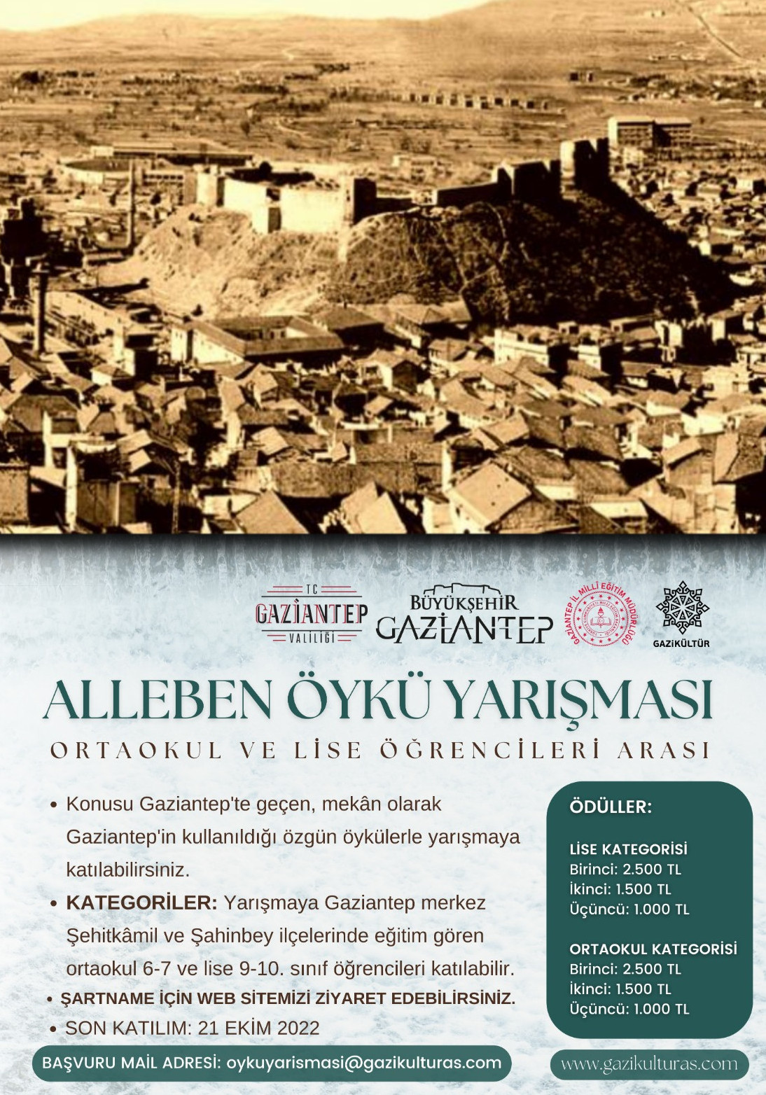Gaziantep Valiliği koordinasyonunda Gaziantep Büyükşehir Belediyesi Gazikültür ve Gaziantep İl Milli Eğitim Müdürlüğü'nün düzenlediği “Alleben Öykü Yarışması”na başvurular başladı.