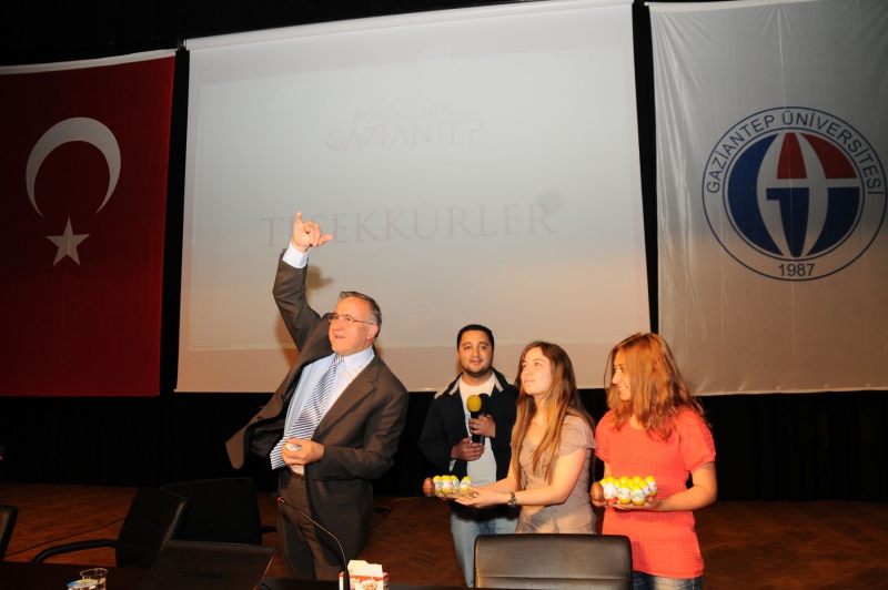 Söyleşiye Gaziantepin son yedi yıllık gelişim sürecini anlatarak başlayan Dr. Asım Güzelbeyin konuşması sırasında sahneye çıkan bir öğrenci söz isteyerek; Gaziantep Üniversitesinin bir çok alanda farklı bir Üniversite olduğunu söyleyip, burada konuklara yumurta atılmaz diyerek, ellerindeki çikolatalı yumurtaları Dr. Asım Güzelbeye uzattı. Başkan Güzelbey kısa bir şaşkınlık sonrasında, önünde duran çikolatalı yumurtaları Atatürk Kültür Merkezinde bulunan öğrencilerin üzerine atmasıyla oldukça ilginç dakikalar yaşandı.