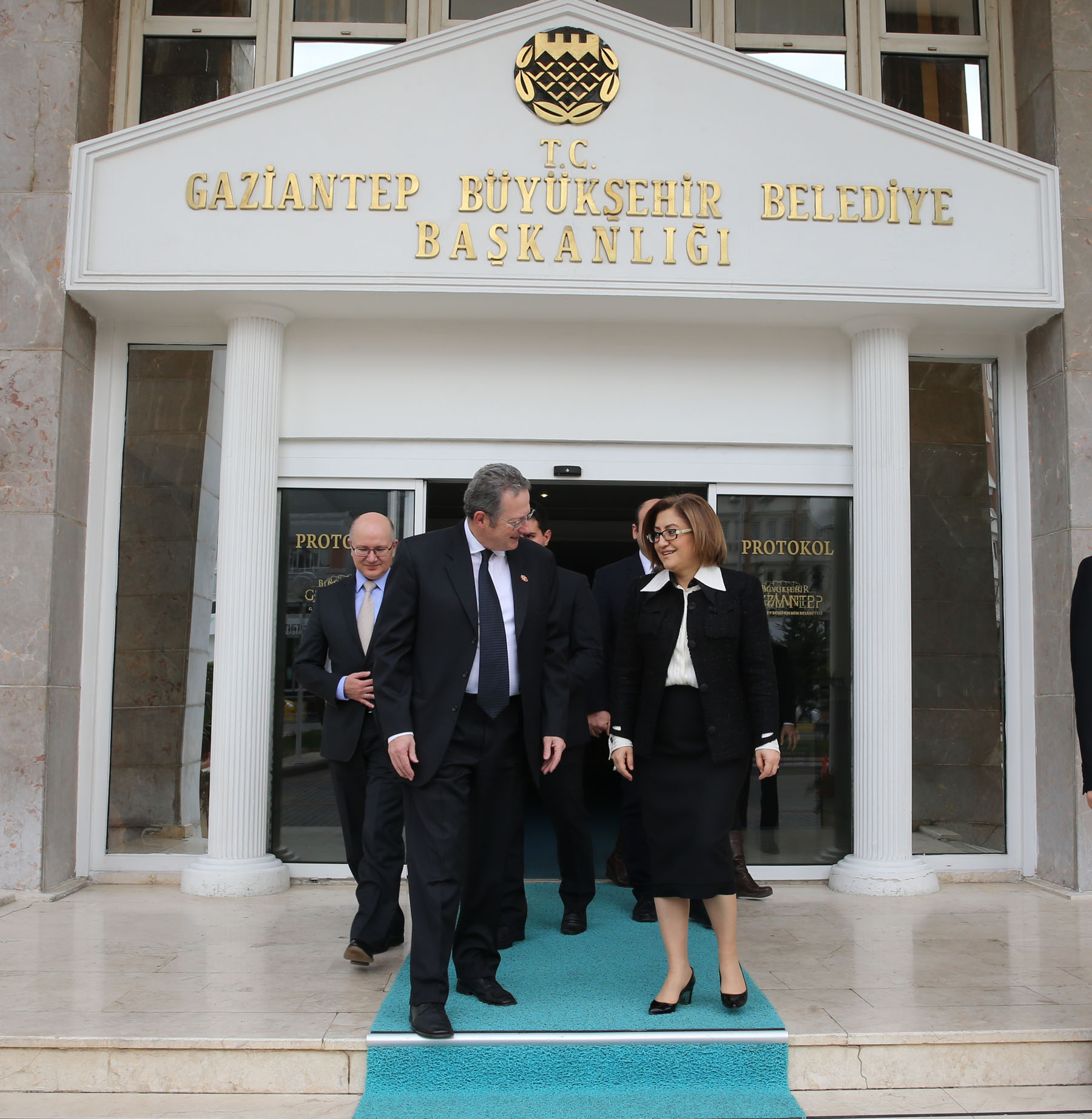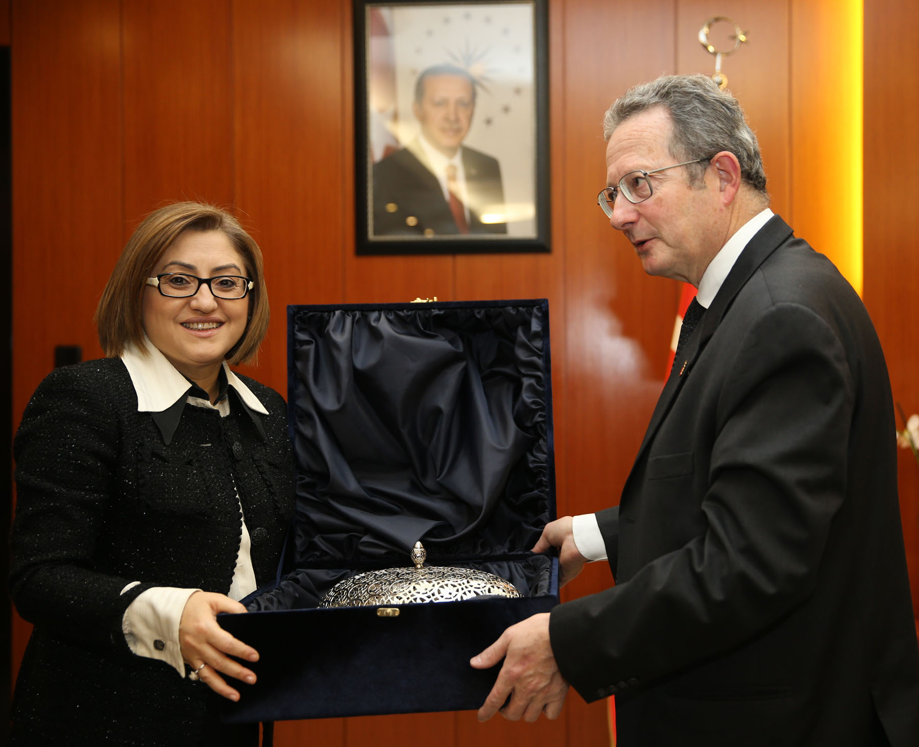 Konuşmaların ardından Şahin, Trenteseau’ya Gaziantep’e özgü bakır işlemli tabak hediye etti.