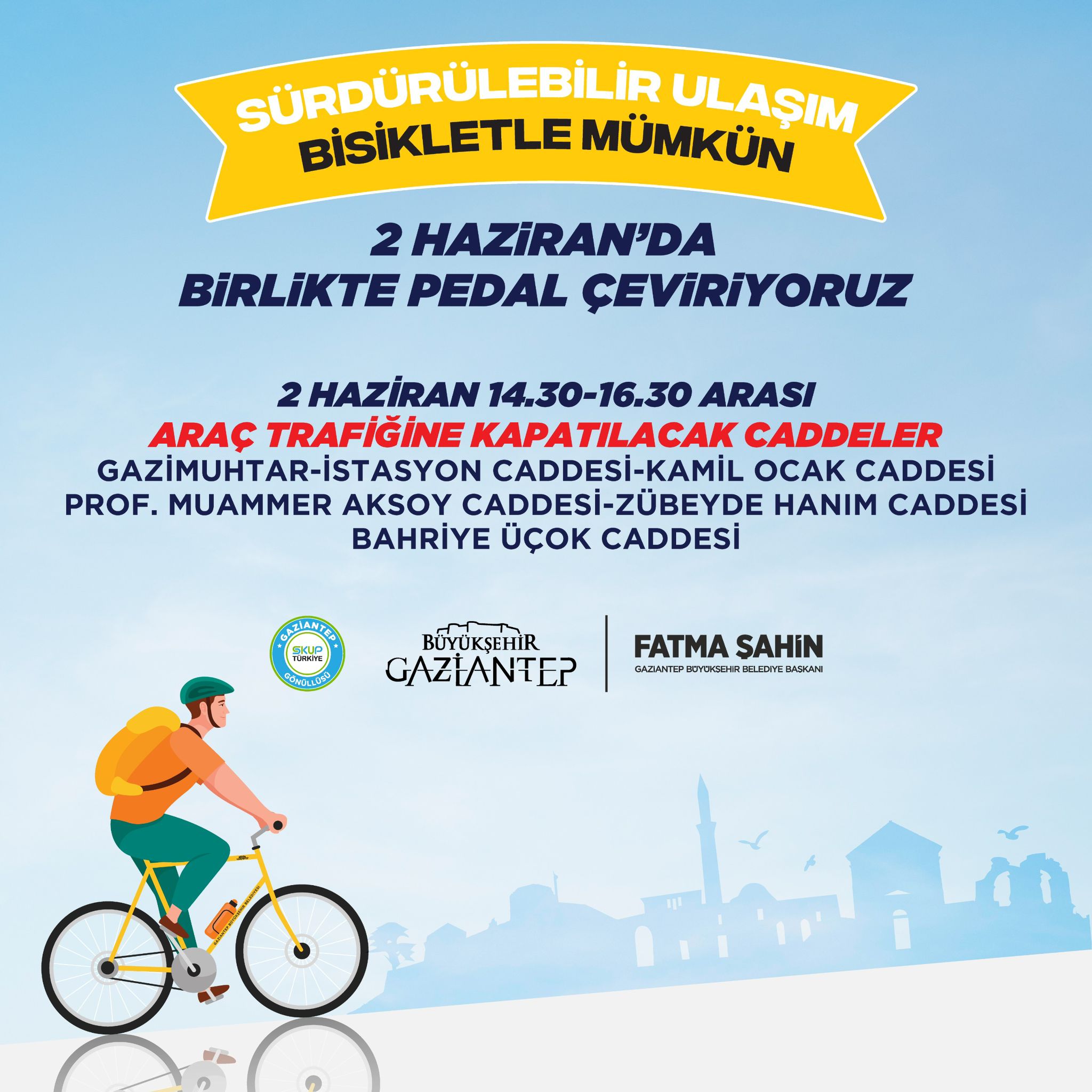 Gaziantep Büyükşehir Belediyesi tarafından organize eden “Birlikte Pedal Çeviriyoruz” etkinliği nedeniyle 2 Haziran Pazar günü saat 14.30 ve 16.30 saatleri arasında Gazimuhtar Caddesi, İstasyon Caddesi, Kamil Ocak Caddesi, Prof. Muammer Aksoy Caddesi, Zübeyde Hanım Caddesi, Bahriye Üçok Caddesi araç trafiğine kapatılacak.