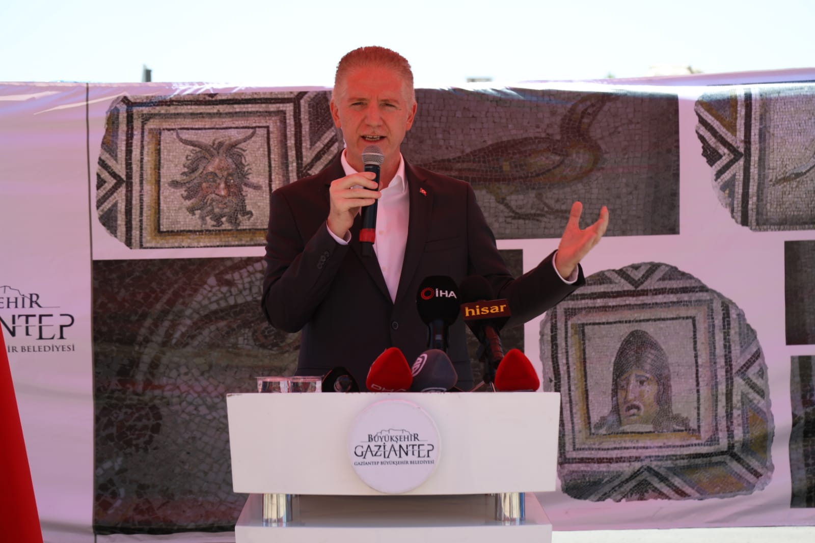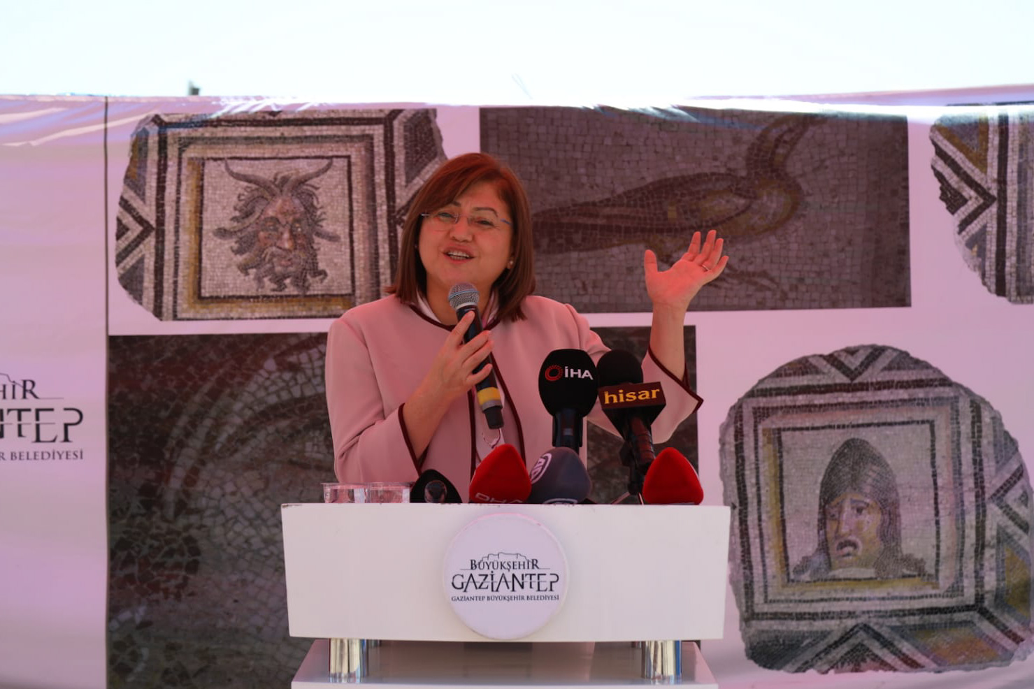 Başkan Şahin konuşmasında gönderilen replikaların Fırat Nehri’nin taşlarından yapıldığını hatırlatarak, “Mozaik ustalarımızın burada yetişmesi, bu coğrafyada geleceğe taşımamız için önemli bir fırsattı. Ustalarımız yetişti ve bu eserler orijinallerine uygun bir şekilde 2 yılda tamamlandı. Orijinali aratmayacak şekilde yapılan bu eserleri gönderiyoruz. Şu anda arkada büyük bir medeniyeti kültür ve sanat insanlarımızla nasıl modernize ettiğimizi, nasıl yereli evrenselleştirdiğimiz, nasıl geleneği geleceğe taşıdığımızı gösteren büyük bir hazinedir” diye söyledi.