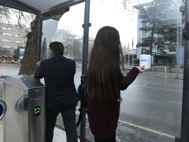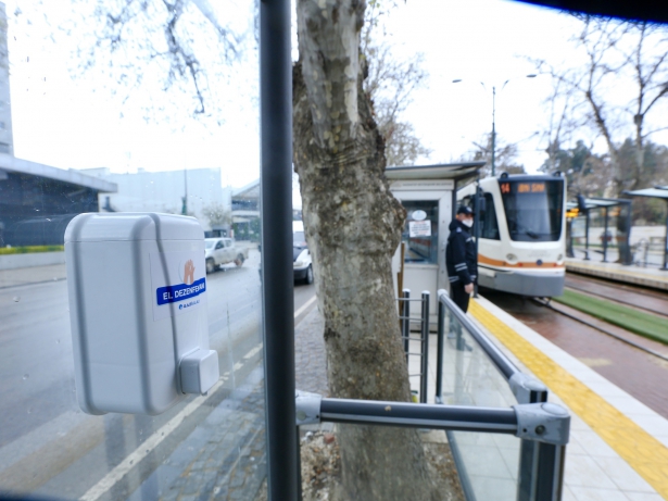 Büyükşehir Belediyesi ekipleri, gündelik dezenfektan çalışmalarının yanı sıra her tramvay durağına el dezenfektanı yerleştirdi. Yolcular tramvaya binerken ve inerken duraklarda bulunan dezenfektanlarla el hijyenini sağlayabilecek. Ayrıca büyükşehir dezenfekte ekibi, şehirde bulunan bütün toplu taşıma araçları ve taksilere yönelik dezenfektan çalışmalarınI aralıksız sürdürüyor.