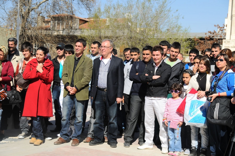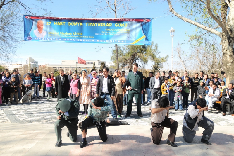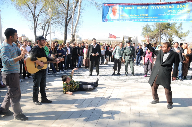 27 Mart Dünya Tiyatrolar Günü dolayısıyla Gaziantepe gelen usta tiyatrocu Mazlum Kiperde Sokak gösterisini izleyenler arasında yer aldı.