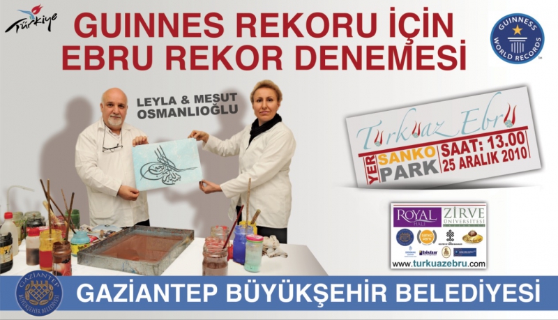 2.200 litre su, 30 kg kitre, 5 litre boya ve 60 m² kumaş kullanacağımız Dünyanın En Büyük Ebrusu Rekor Denemesi için sayılı günler kaldı. Gaziantep halkının da bizimle aynı heyecanı taşıdığını gelen telefonlardan ve yolda bizi çevirip sormalarından anlıyoruz. 25 Aralıkta SANKO Park AVM de gerçekleştireceğimiz rekor denemesinin büyüklüğüne yaraşır bir kalabalığı orada görmek istiyoruz diye konuştu.