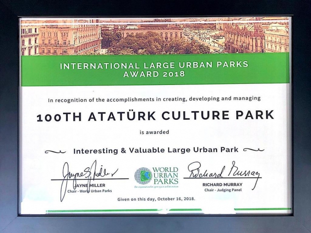 Bu kapsamda Avustralya’nın Melbourne şehrinde “Internatıonal Parks And Leısure Congress’’ kapsamında ödüller sahiplerini buldu. 20 ülke ve 700 delegenin katıldığı kongrede ‘100. Yıl Atatürk Kültür Parkı’ ödül gecesi boyunca sunum slaytla dünyaya tanıtıldı.