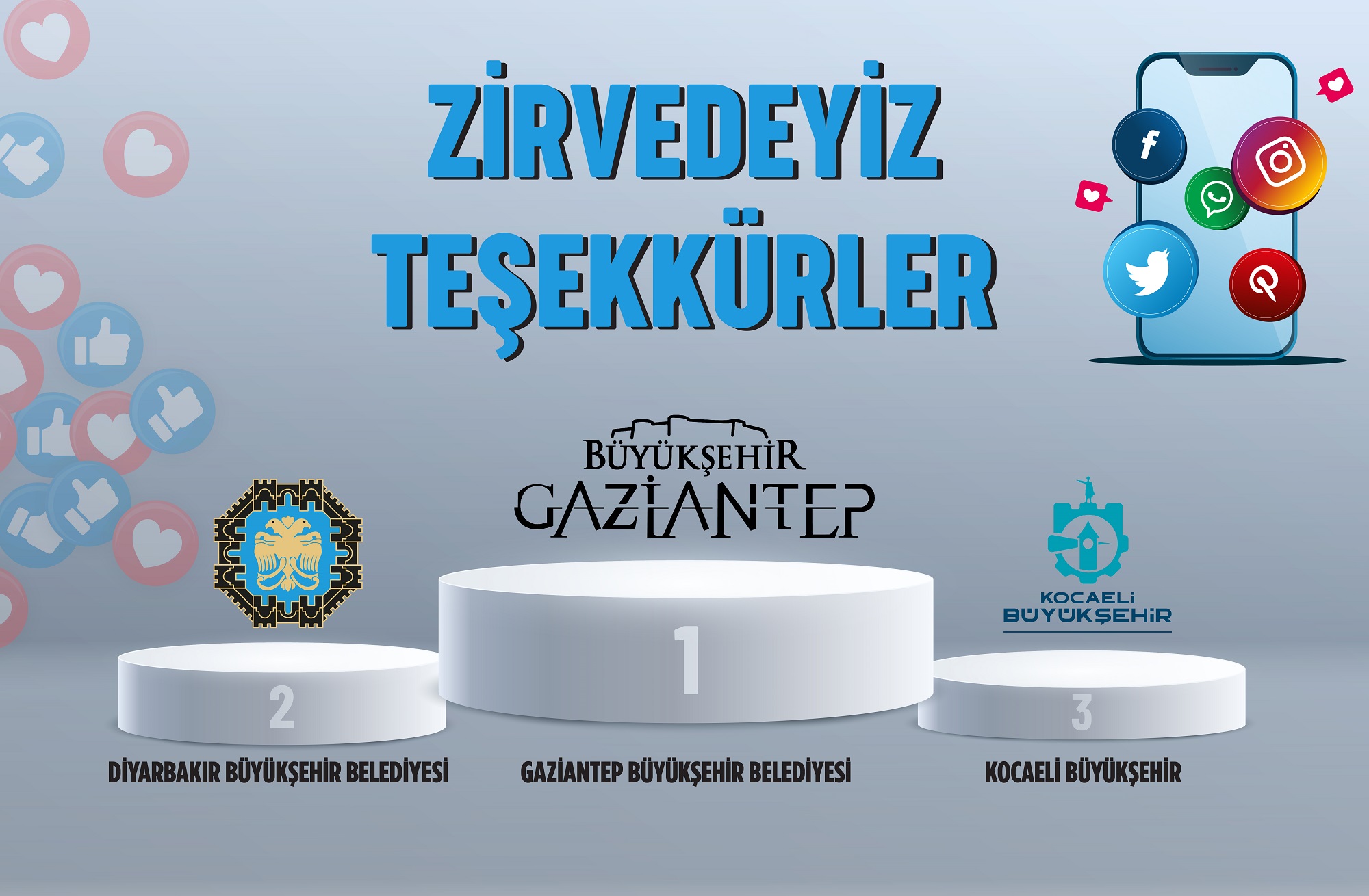 Gaziantep Büyükşehir’i Diyarbakır Büyükşehir Belediyesi ve Kocaeli Büyükşehir Belediyesi takip etti. Ankara Büyükşehir Belediyesi 4’üncü, İstanbul Büyükşehir Belediyesi 5’inci, İzmir Büyükşehir Belediyesi ise listede 6’ncı sırada yer aldı.