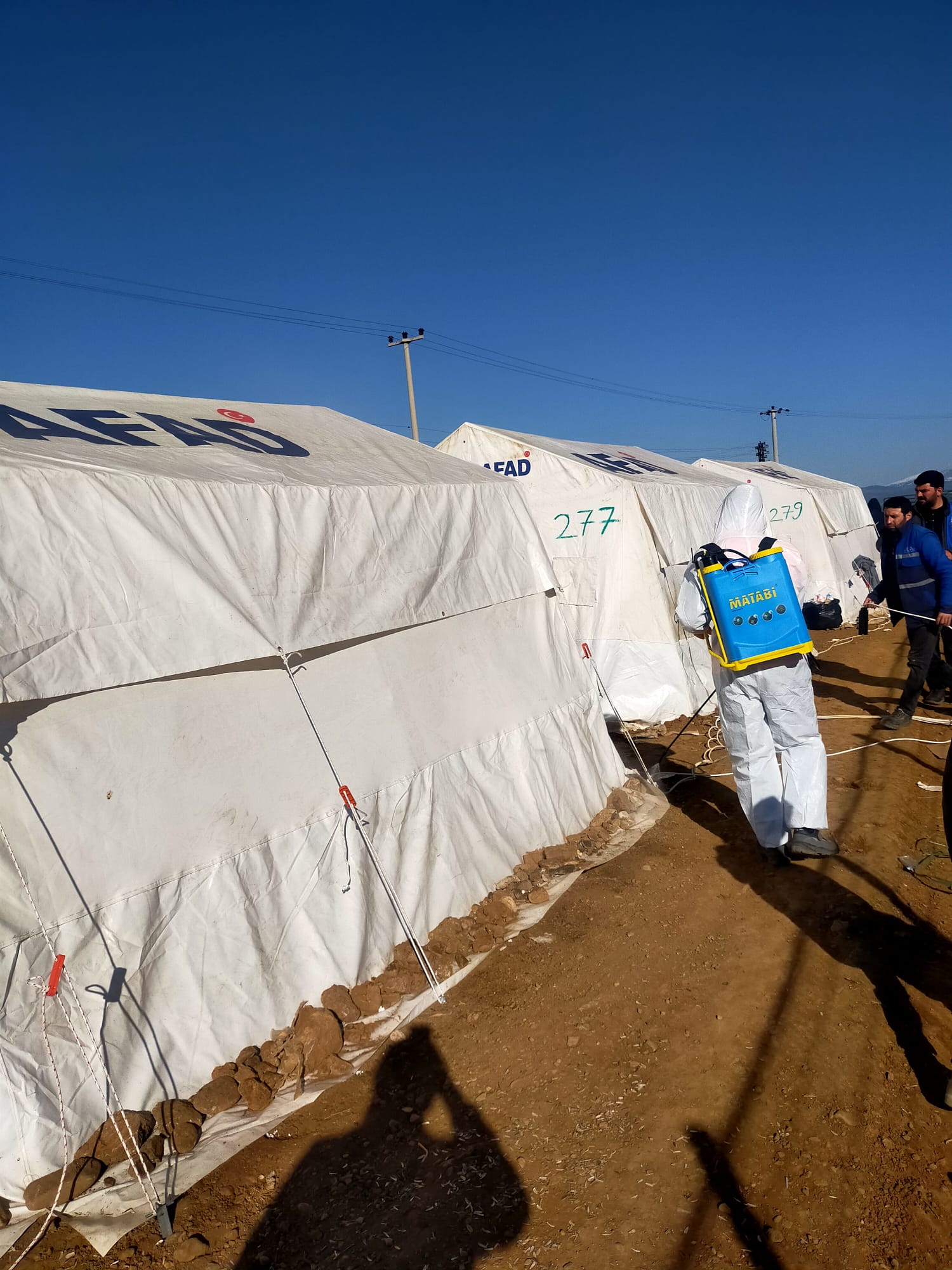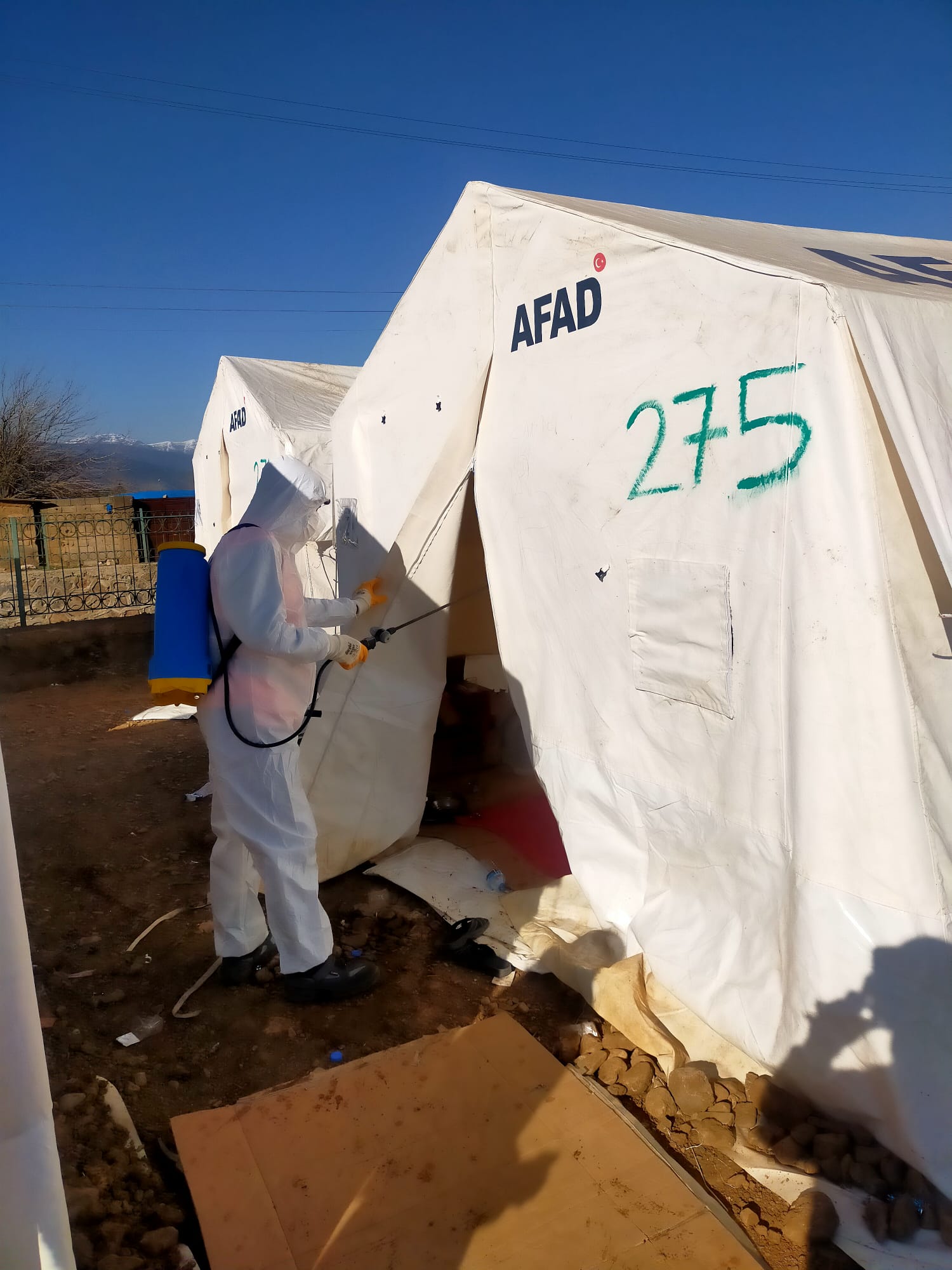Gaziantep Büyükşehir Belediyesi, Kahramanmaraş merkezli meydana gelen deprem sonrası toplu alanlarda konaklayan depremzedelere vektörel hastalıkların bulaşmasını engellemek için ilaçlama çalışmalarını sürdürüyor.