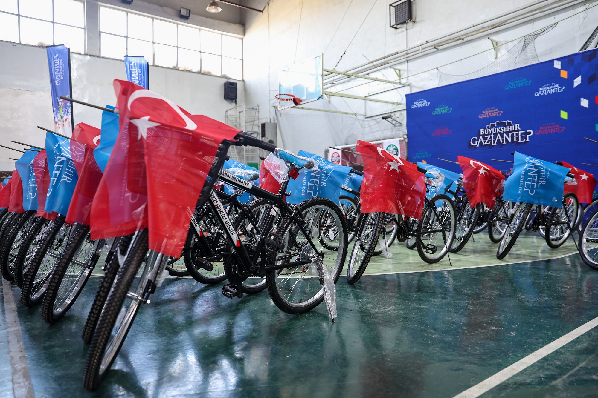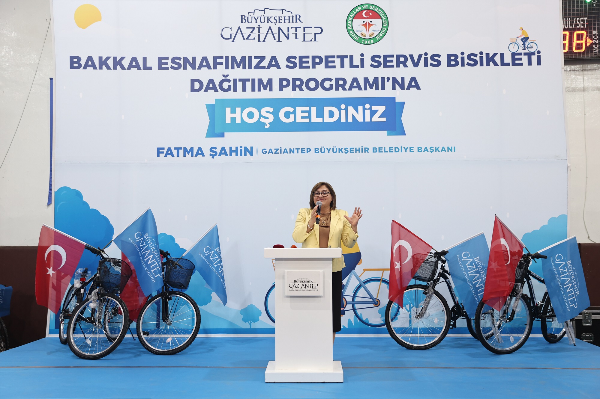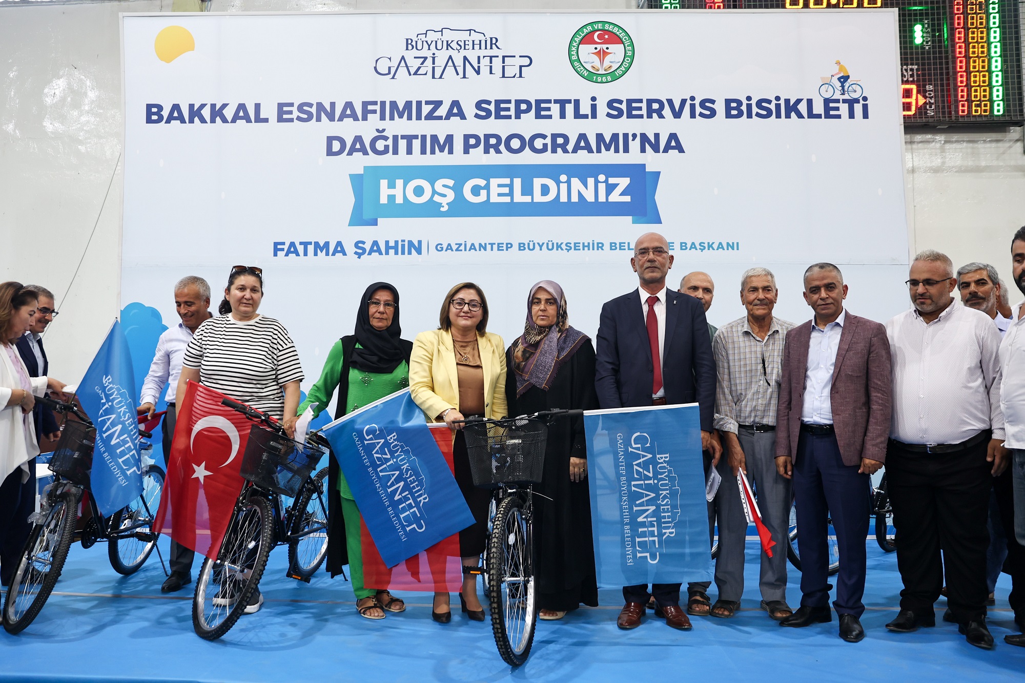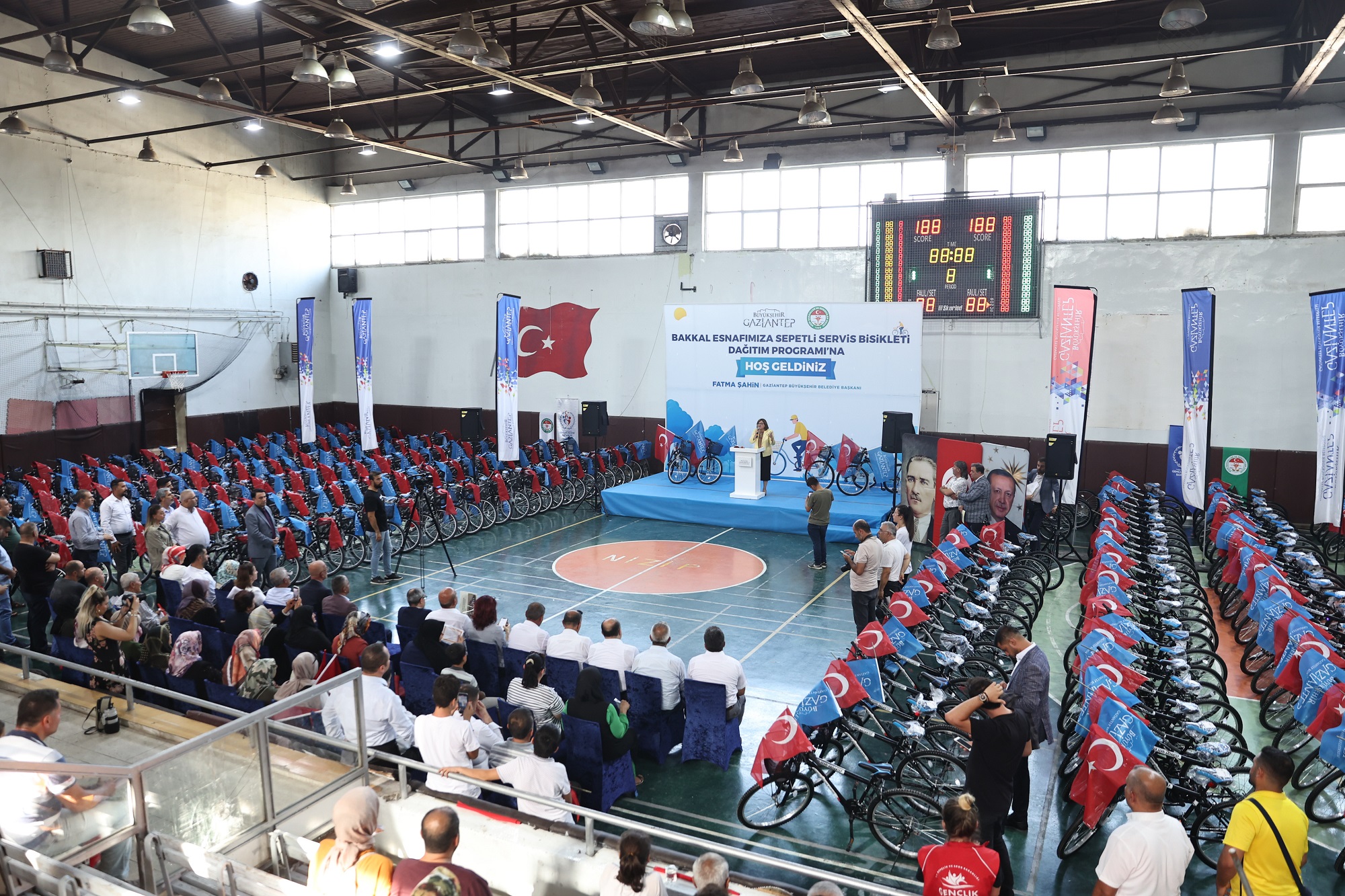 Nizip Kapalı Spor Salonu’nda Gaziantep Büyükşehir Belediye Başkanı Fatma Şahin’in katılımıyla yapılan dağıtım töreninde, sağlıklı ve çevreci ulaşım aracı bisikletler, bakkalların gelişen sektörde çağa ayak uydurması için gelen talepler doğrultusunda hediye edildi.