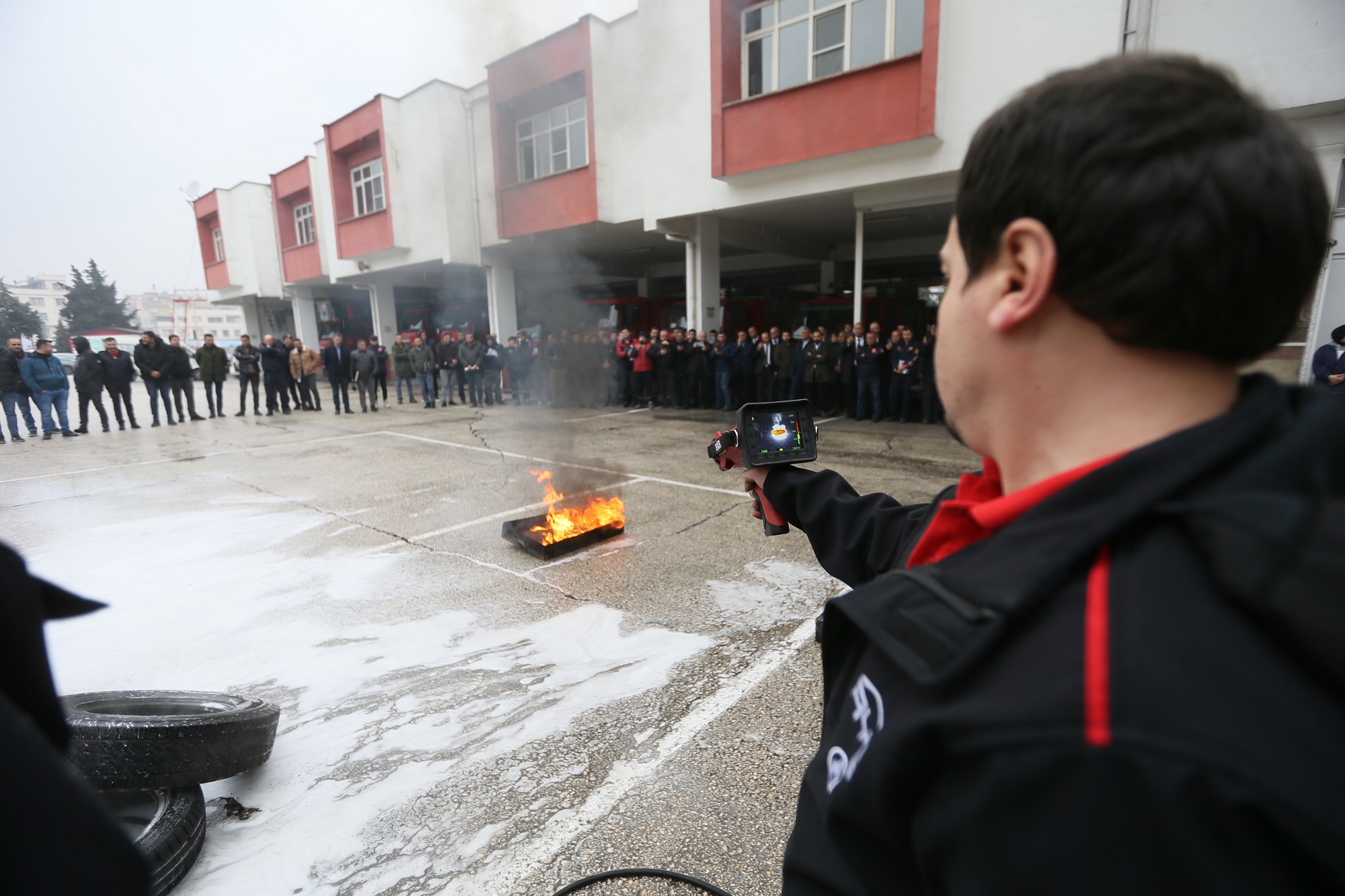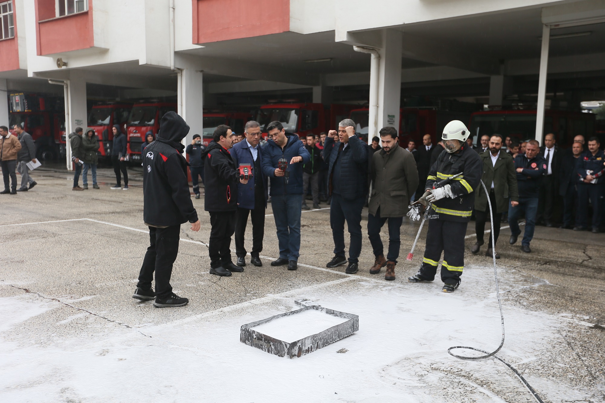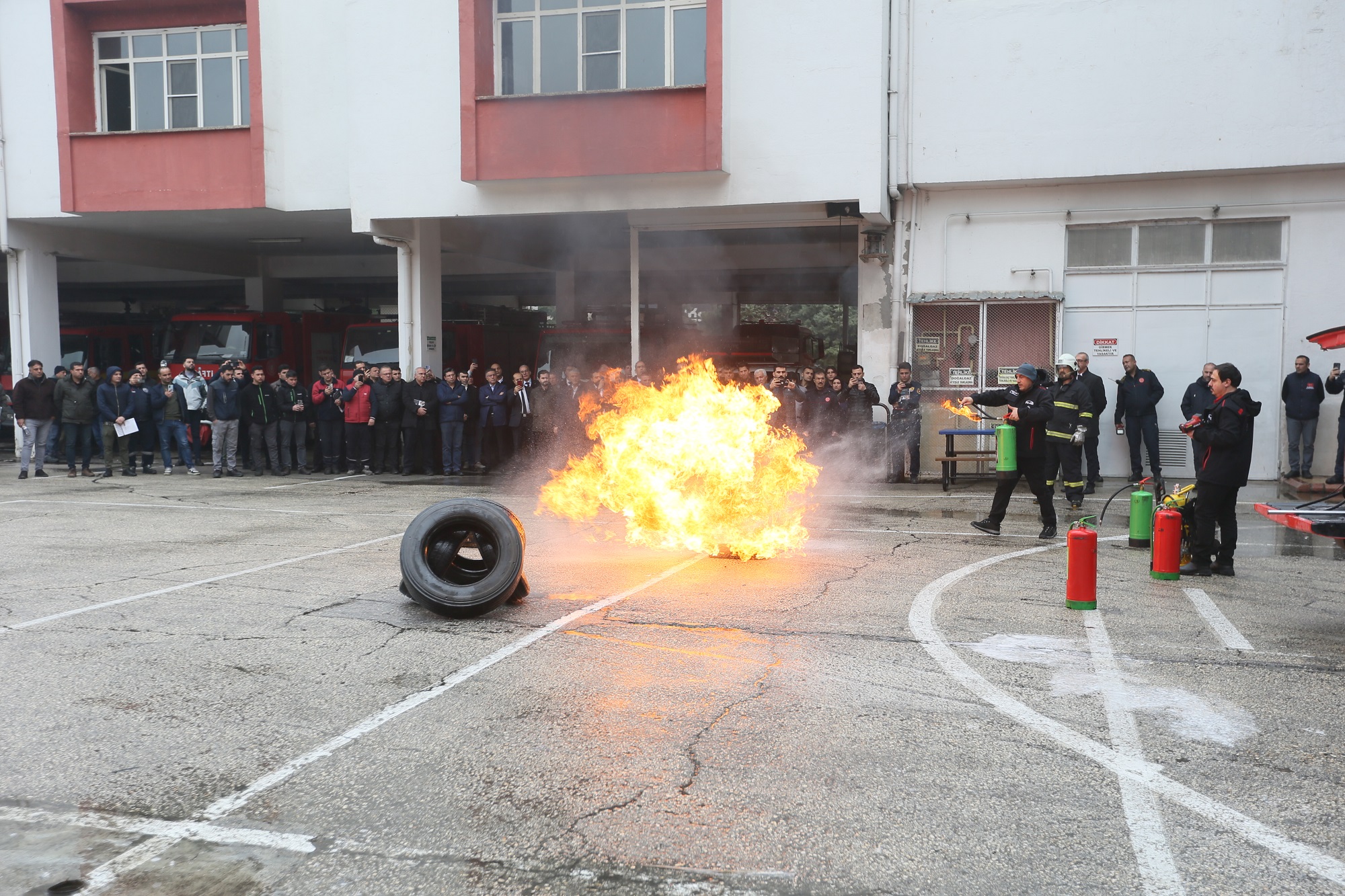Eğitici Sırma bu kimyasal sıvı aralığıyla elektrikli araçlarda bulunan lityum iyon batarya yangınlarını söndürebileceğinin de bilgisini vererek tatbikatı gerçekleştirdi.