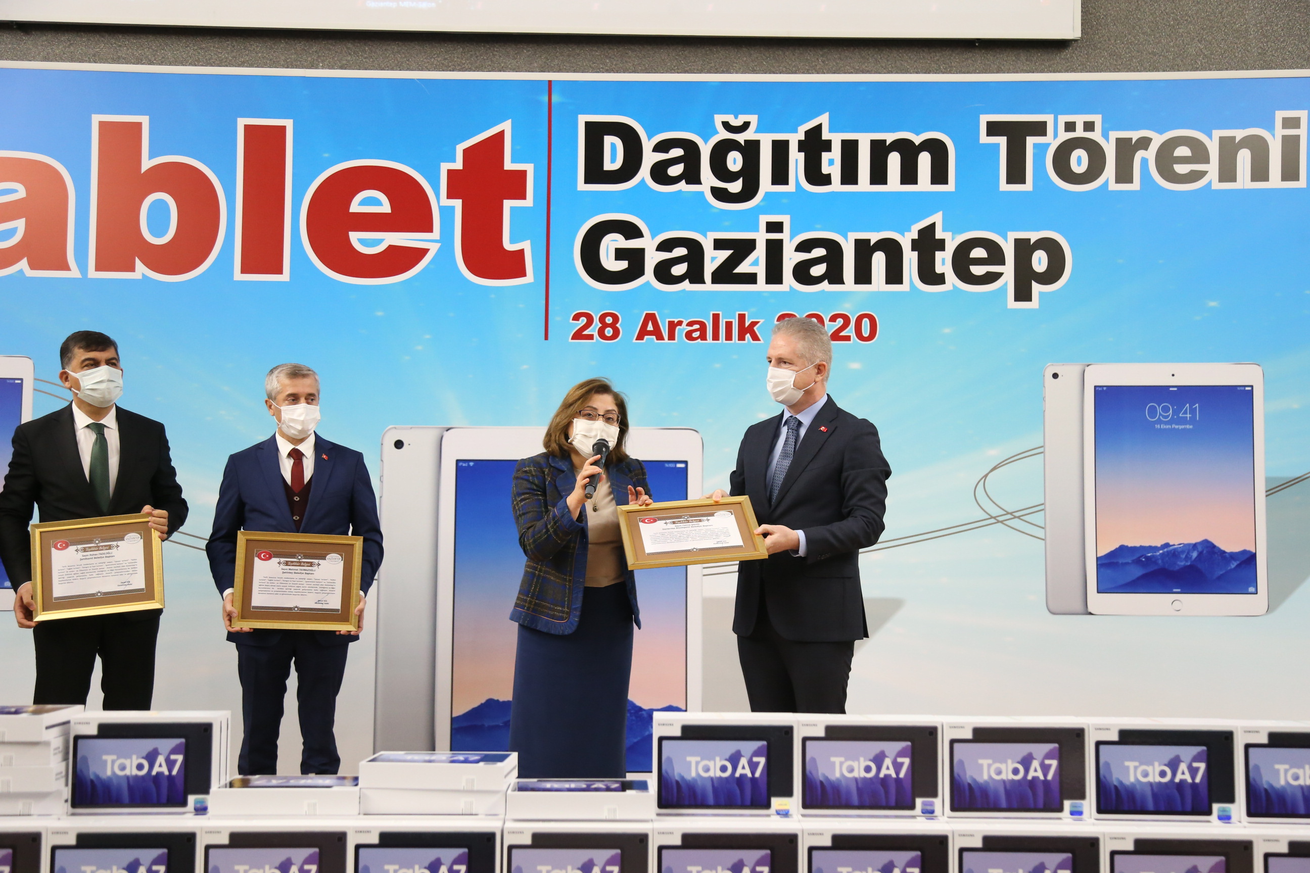 Kentte kamu kurumları başta olmak üzere özel sektörle de ortaklaşa hareket etmeyi gerekli kılan Gaziantep Modeli sayesinde Gaziantep Valiliği koordinasyonunda Gaziantep Büyükşehir Belediyesi ile Şahinbey Belediyesi’nin 20 bin, Şehitkamil Belediyesi ve Organize Sanayi Bölgesi’nin (OSB) 10 bin olmak üzere toplamda 60 bin tablet desteği dikkatleri üzerine çekerek Başkan Fatma Şahin’in yanı sıra Gaziantep Valisi Davut Gül, Şahinbey Belediye Başkanı Mehmet Tahmazoğlu, Şehitkamil Belediye Başkanı Rıdvan Fadıloğlu ve Organize Sanayi Bölgesi Yönetim Kurulu Başkanı Cengiz Şimşek’e de Bakan Selçuk’tan teşekkür belgesi getirdi.