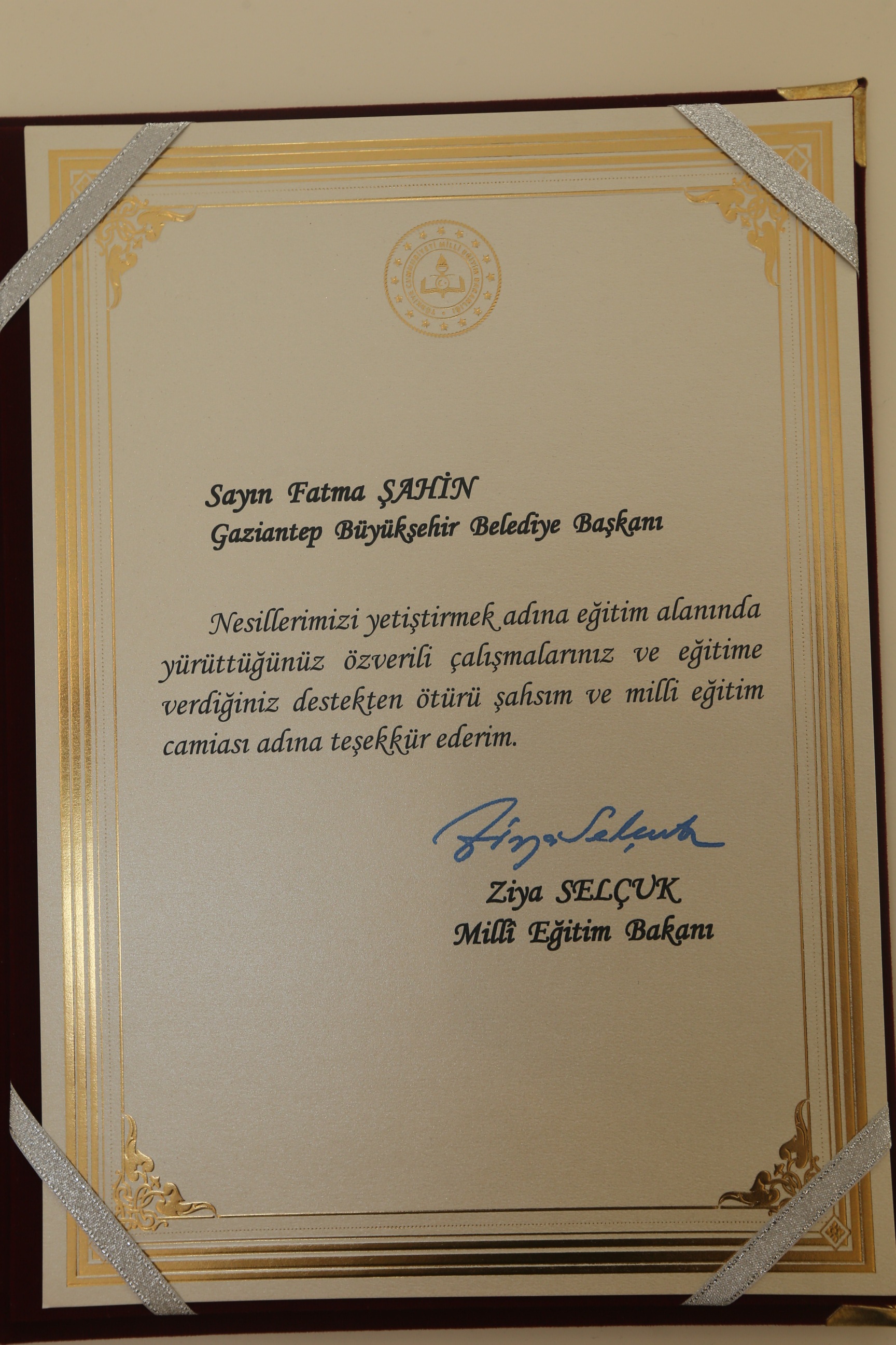 Birlikte iş yapma modeli olarak Türkiye’deki yerel yönetim anlayışına yeni bir pencere açan Gaziantep Büyükşehir Belediye Başkanı Fatma Şahin’in, Pandemi tehdidinin şehri sarmasının ardından eğitim çatısı altında başlattığı yardım seferberliği Milli Eğitim Bakanı Ziya Selçuk’un takdirini kazandı. Bakan Selçuk’un gönderdiği Teşekkür Belgesi’nde; nesilleri yetiştirmek adına Başkan Fatma Şahin’in eğitim alanında yürüttüğü özverili çalışmalara ve eğitime verdiği desteğe dikkati çekerek, şahsı ve milli eğitim camiası adına Başkan Şahin’e teşekkürlerini iletti.