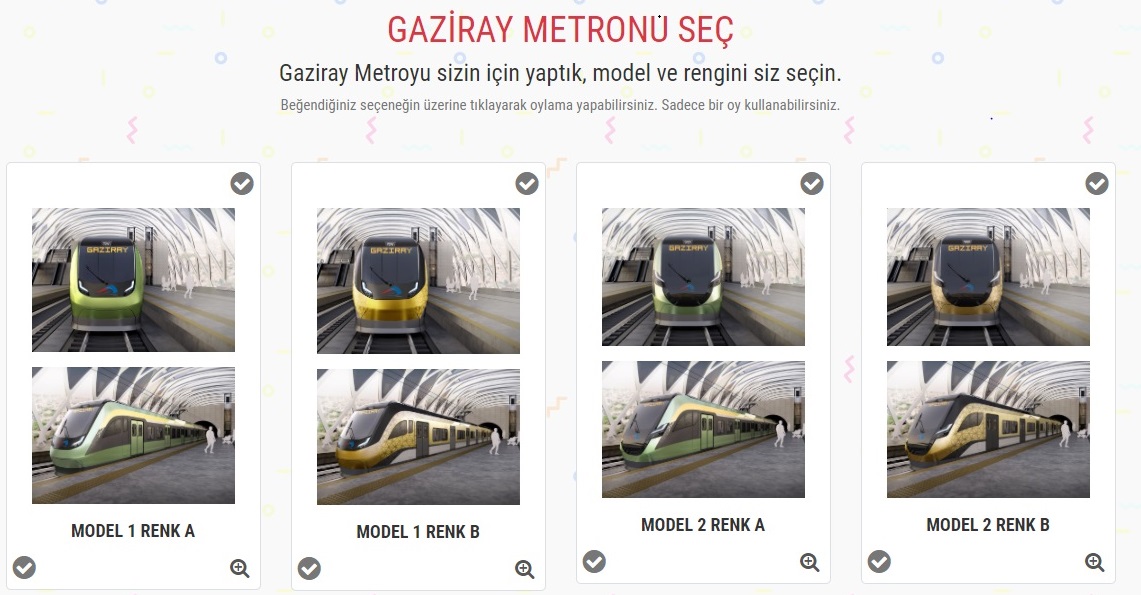 “GAZİRAY Metronu Seç” sloganı ile kamuoyuna sunulan ankette, 2 farklı modelde sarı ve yeşil tonlarının yer aldığı trenlerin görselleri arasından seçim yapan Gazi şehirliler yüzde 31,4 oranla Model 2 Renk B kategorisinde bulunan baklava sarısını birinci seçti. Model 2 Renk A kategorisindeki fıstık yeşili ise yüzde 27.9 oranla ikinci sırada konumlandı.