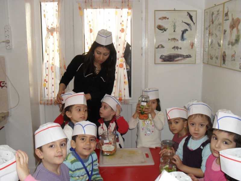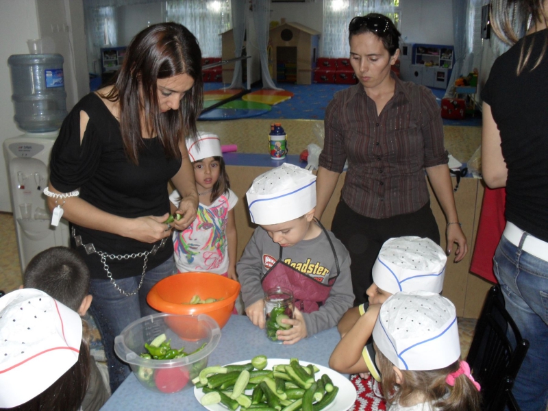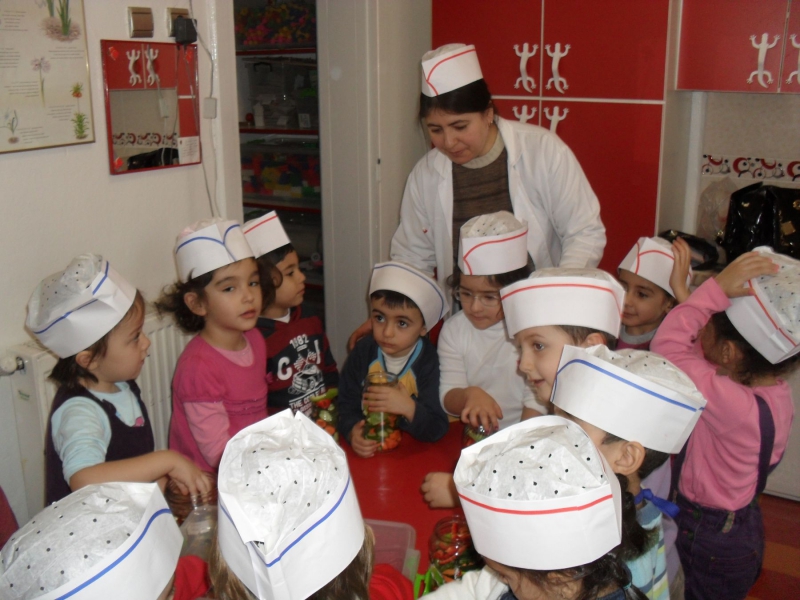 Anaokulumuzun 5 yaş Çalışkan Arılar, 5 yaş Çalışkan Tavşanlar ve 6 yaş Zeki Kelebekler gurubu öğretmenleri ve gurup teyzeleriyle birlikte, Anaokulu bahçesinde yetiştirdikleri salatalık, biber ve domatesleri temizleyen minikler adlarının yazılı olduğu kavanozlara hazırladıkları turşuyu kordular.