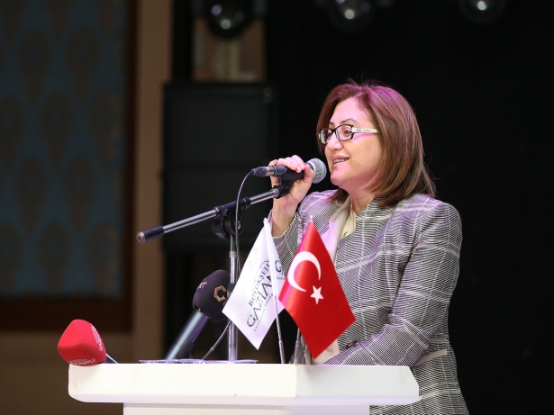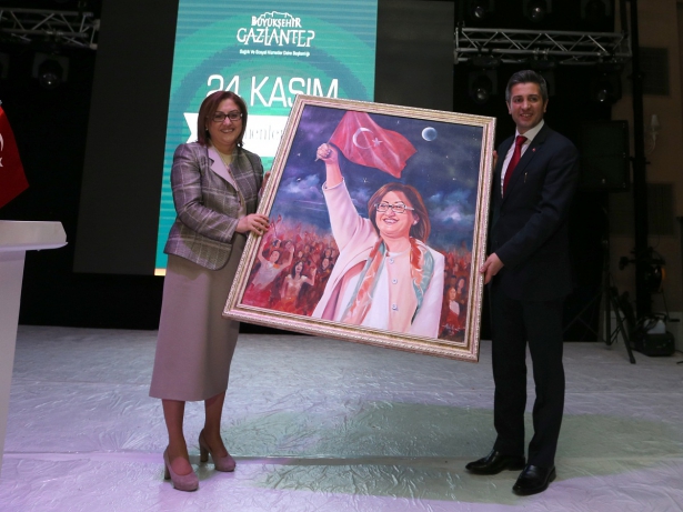 Konuşmanın ardından İl Milli Eğitim Müdürü Cengiz Mete, Büyükşehir Belediye Başkanı Şahin'e resminin bulunduğu tabloyu hediye etti.