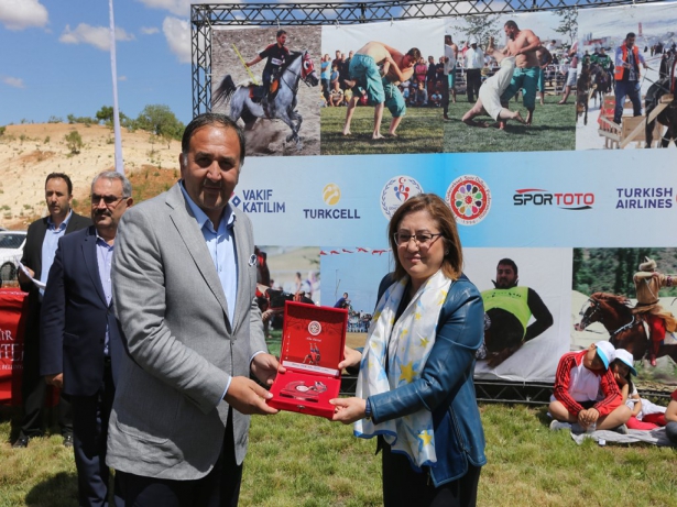 Bu arada müsabakalardan önce Büyükşehir Belediye Başkanı Fatma Şahin’e desteklerinden dolayı Geleneksel Spor Dalları Federasyonu Asbaşkanı Şahin Hopur tarafından plaket verdi.