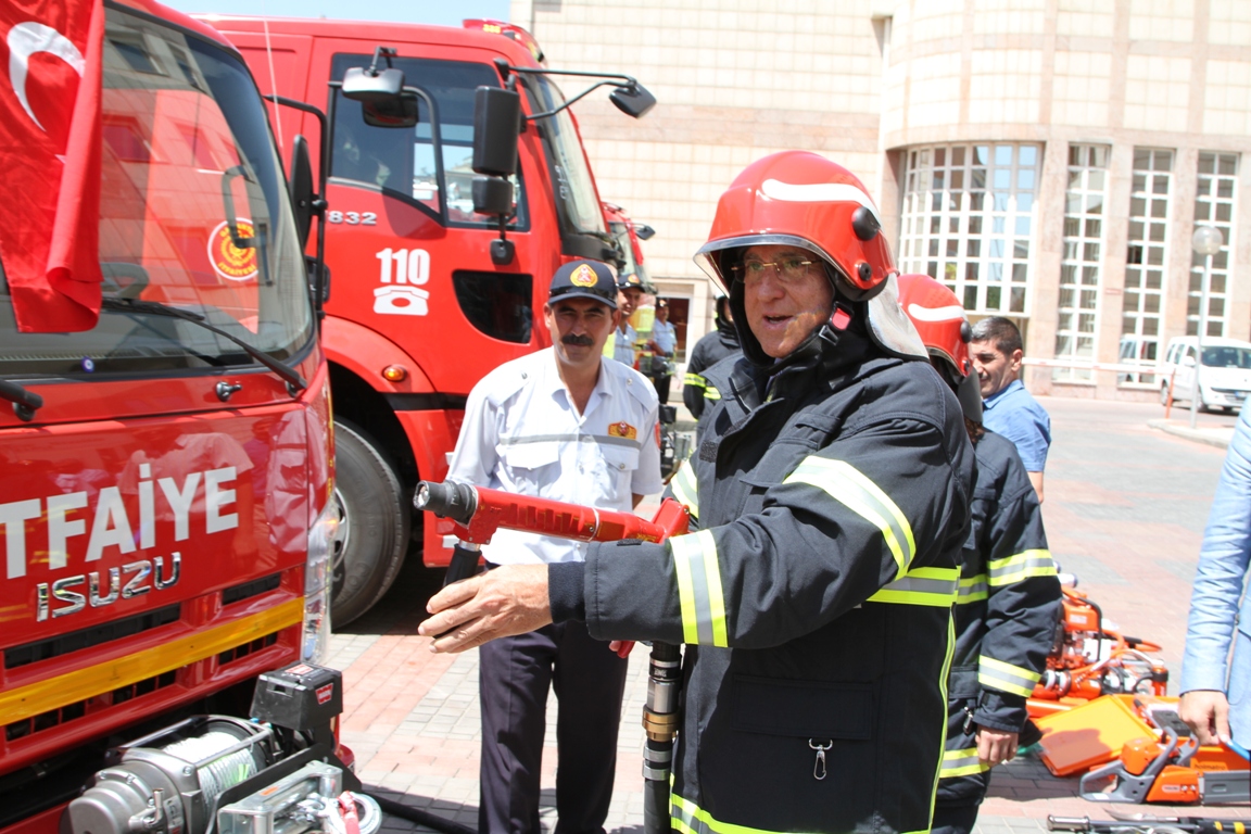 Basın açıklamasının ardından itfaiye elbisesi giyen Güzelbey, yeni alınan itfaiye araçlarını tanıtıp, küçük araçların biri ile tanzikli su sıkarak deneme yaptı.