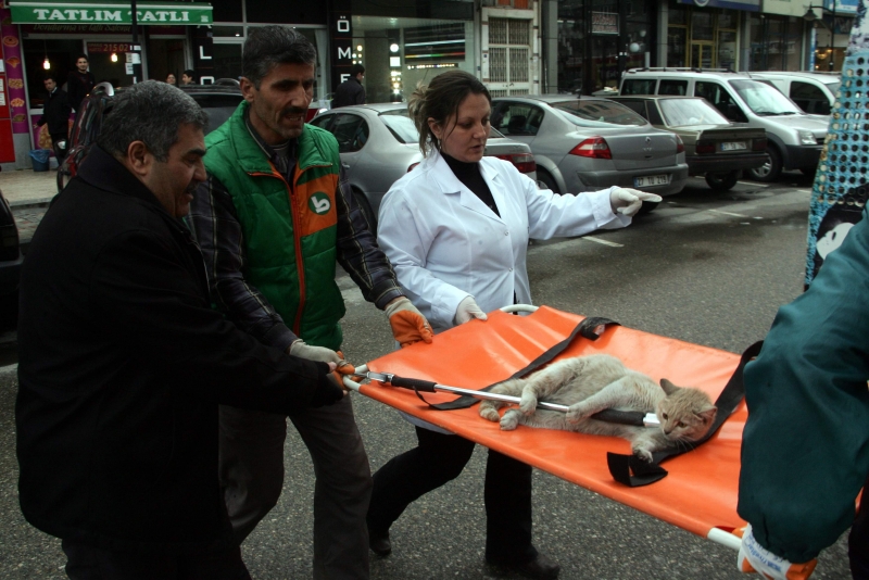 Bu sırada olay yerine gelen Gaziantep Büyükşehir Belediyesi Hayvanat Bahçesi yetkilileri kedinin durumunu inceledi. Veteriner eşliğinde gelen ekipler yaralı halde saldırgan olan kediyi büyük bir titizlikle hazırlanan sedyeye koydu. Sedye ile taşınan kediye daha sonra sakinleştirici iğne yapıldı. Arka ayaklarının kırık olduğu tahmin edilen kedi vatandaşların meraklı bakışları arasında alındı. Araca konulan kedi tedavisi için hayvanat bahçesine götürüldü. Vatandaşlar ise kediye sahip çıkan belediye ekiplerine teşekkür etti.