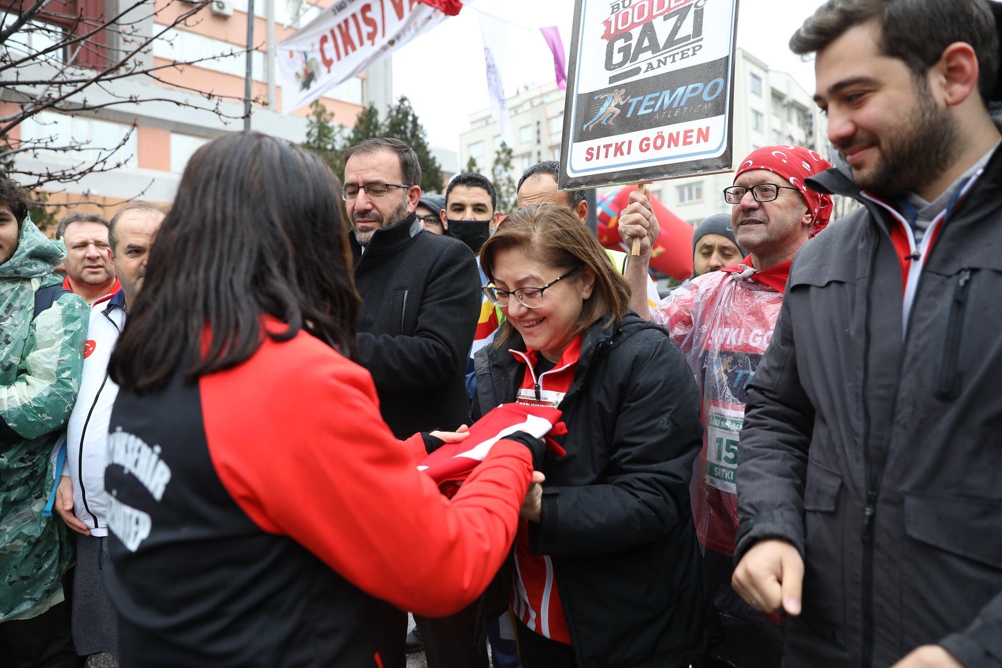 Koşular öncesi konuşma yapan Büyükşehir Belediye Başkanı Fatma Şahin, organizasyona katılan herkese teşekkür ederek, “Yüz yıl önce atalarımız ne yağmur ne kar ne açlık dinledi. Gaziantep Kalesi’ne ay yıldızlı bayrağı takmak için canını verdi. 6 bin 317 şehidin torunları olarak buraya geldiğiniz için helal olsun size. Gazi Mustafa Kemal Atatürk, Gazi Meclis’i toplayarak ‘Ben Gazianteplilerin gözlerinden nasıl öpmem ki? Onlar yalnız Gaziantep'i değil Türkiye’yi de kurtardılar’ dedi. Gazi Mustafa Kemal Atatürk ve bütün şehitlerimizi rahmet ve minnetle anıyoruz. ‘Ey şehit oğlu şehit, isteme benden makber, sana aguşunu açmış duruyor Peygamber’ diyen ecdadın torunları, sizlerle gurur duyuyoruz. Başkanınız olarak sizlerle yeni hedeflere gidiyoruz. İkinci yüzyılın destanını siz gençler yazacaksınız. Gaziantep’i ‘Eğitim, Spor Şehri’ sizler yapacaksınız. Hayat bir maraton. Bu coğrafyada çok çalışacak, güçlü olacağız. Gelecek sizlerin. Bunun için, koşuyoruz. Bu maratonu Gazi’nin adıyla koşuyoruz. Bütün dünyaya ‘Unutmadık, unutturmayacağız’ diyerek hep birlikte Gaziantep için koşmaya hazırız. Koş Gaziantep, Koş Gazi’nin torunları. Yolunuz bahtınız açık olsun” diye konuştu.