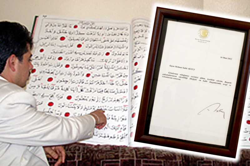 Mektubunda, "Sayın Mehmet Sabit Akyüz, göndermiş olduğunuz eserinizi aldım, teşekkür ederim. Başarılı çalışmalarınızın sürekliliği dileğiyle en kalbi duygularimla sevgi ve selamlarımı sunarım" cümlelerine yer veren Başbakan Erdoğan, Akyüz'e teşekkürlerini iletti.