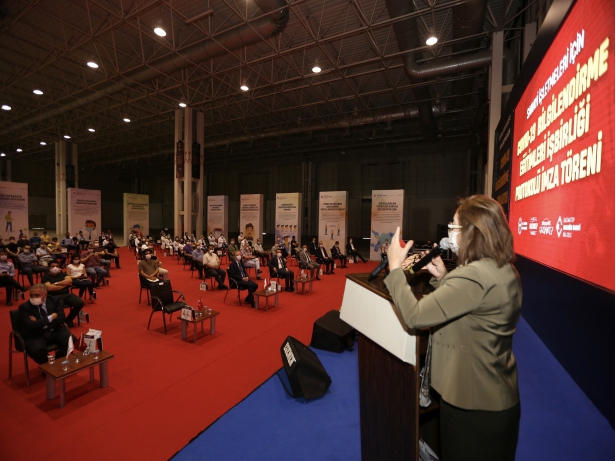 Başkan Fatma Şahin, ‘Gaziantep Modeli’ olan birlikte iş yapma anlayışının kentin sanayi işletmelerinde de varlığını sürdürdüğünü belirterek, “En zor zamanda bir araya gelme modelinde ‘şikayet etme çare bul’ diyoruz. Eğitici eğitimleriyle 200 bin kardeşimizin yaşam şeklini ve bakış açısını salgına ilişkin düzenlemek adınaiş birliği içindeyiz. Her insanın başına bir denetleme mekanizması koyarak salgına yönelik başarı sağlamak güç olur. Bu nedenle herkes kendi sorumluluk bilinciyle kendi denetleme mekanizmasını oluşturmalıdır. Çok önemli bir dönemden geçiyoruz. Dünyadaki büyük devlet tanımı pandemiyle birlikte değişim gösterdi. Şu anda sağlık zinciri, tedarik zinciri, maske üretimi ve çevre duyarlılığı olmayan ülke için büyük devlet tanımı yapamayız. Biz, Türkiye olarak salgın mücadelesinde gösterdiğimiz başarıyla diğer ülkelerde pozitif ayrıştık. Salgında düşük risk grubunda başladık, sosyal yardım ağında şehirde önemli işlere imza attık. Sosyal belediyeciliğin gerekliliklerini büyük bir özveriyle yerine getirdik. İlk maskeyi üreten şehir olduk. Şehrimizin hijyen üretimi de ulusal mücadelede önemli bir noktada yer alıyor. O yüzden bu şehrin büyük sorumluluğu var. Bizim üretmemiz lazım. Bu bir zorunluluk. Tırnak tırnak çalışmalıyız. Bugün burada olmamızın nedeni; 200 bin arkadaşımızı pandemiye karşı bilinçlendirmektir. 200 bin işçinin sağlığı bize emanet” dedi.