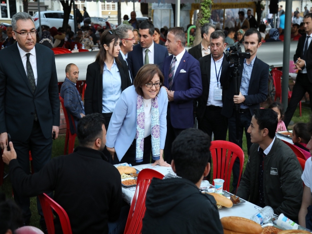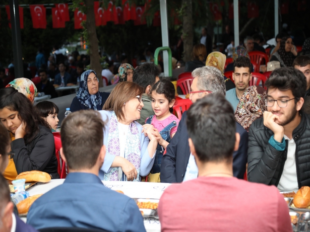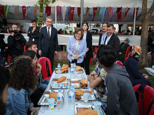 Büyükşehir Belediye Başkanı Fatma Şahin, 11 ayın sultanı Ramazan Ayı'nın başı rahmet ortası mağfiret sonu ise cehennemden kurtuluş olduğunu belirterek, “Bizim geleneksel iftar soframız, kardeşlik soframızdır. 6 yıldır bunu yapıyoruz. Günlük çadırlarda 10 bin kişiye yemek veriyoruz. Ayrıca sokak sofralarımız ve her ilçemizde iftarlar düzenliyoruz. Gündüz çocuklarımıza Hacivat Karagöz orta oyunları oynatıyoruz. Çocuklarımız bu oyunlardan verilecek dersi ve geleneğimizdeki güzellikleri yaşasınlar istiyoruz. Akşamları kardeşlik sofralarımızda bir aradayız. Ramazan, midemize oruç tutturmaktan çok daha öte. Ramazan ayı, sevginin, kardeşliğin, bereketin olduğu bir ay. Yunus Emre’nin, Hazreti Mevlana’nın gözüyle baktığımız zaman gönüllere girmeyi bize hayır duası aldırmak için önemli bir fırsat veriyor. Biz de üniversitenin yanında olduğundan öğrencilerimizle ve burada yaşayan halkımızla bir aradayız. Güzel bir bahçenin içindeyiz. Sevginin, kardeşliğin çoğaldığı bir ayda sevgimizi, kardeşliğimizi çoğaltıyoruz. Ben bütün hemşerilerimizin bu vesileyle Ramazan Ayı’nı mübarekliyorum. Yüce Mevla’m ağız tadıyla bayrama çıkmayı nasip etsin. Bayramı bayram gibi geçirmeyi nasip etsin. Yüksek bir memnuniyet var bunu halkımızın gözlerinde görüyoruz. Orucumuzu beraber açıp duamızı edeceğiz. Dünya’da barış ve savaşların bitmesi için ortak duamızı yapacağız. Çünkü müminin en büyük silahı duadır. Onların hayır dualarıyla güç alıp milletimize hizmet etmeye devam edeceğiz” dedi.