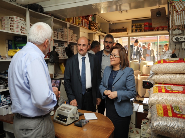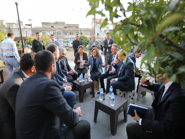 Başkan Fatma Şahin ve beraberindekiler, Çarşı Cami Meydanı’nda çay içti, meydandaki esnafları ziyaret etti.