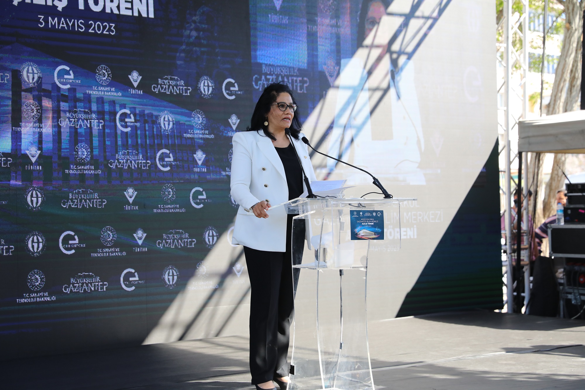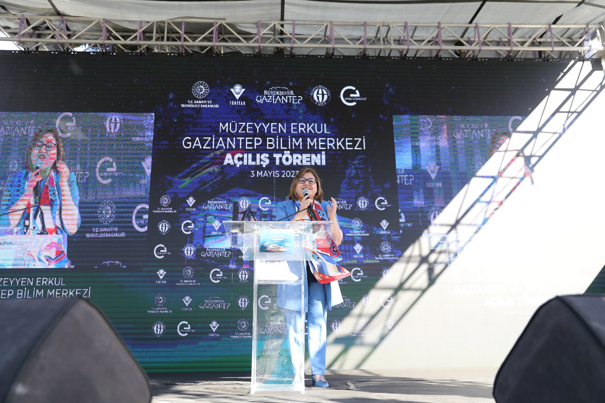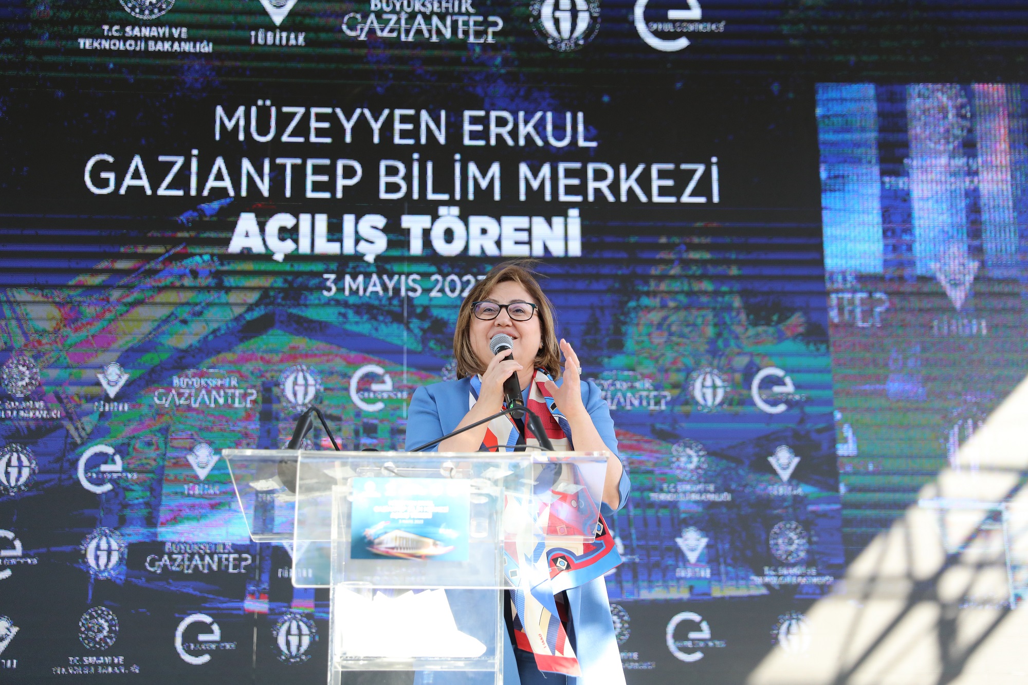 Gaziantep Büyükşehir Belediyesi Başkanı Fatma Şahin, Müzeyyen Erkul Gaziantep Bilim Merkezi’nin açılmasına vesile olan Mehmet Balat ve ailesine teşekkürlerini sunarak, “Gaziantepli hayırseverler bir taraftan aş, iş, ekmek üretiyor. Elindeki bütün ürünleriyle de memleketin çocuğuna okul yapıyor, bilim merkezi yapıyor, hastane yapıyor. Bu memlekette belediye başkanı olmak büyük bir şeref. Bu şehir pusula, kutup yıldızı, örnek şehir, lider şehir. O yüzden bu şehrin bakanları da çok özel. Bugün Sanayi ve Teknoloji Bakanı Mustafa Varank TOGG’u ile buraya şeref verdi. Yerli ve milli otomobilimizle buraya geldik. Rabbime şükürler olsun. Biz çocukken yerli malı üretmeli diye büyüdük. Artık büyük bir Türkiye, güçlü Türkiye kendi yerli ve milli savaş uçağını üreten bir Türkiye” ifadelerine yer verdi.