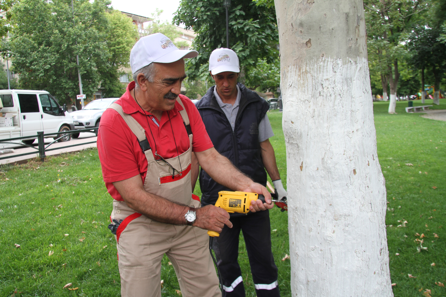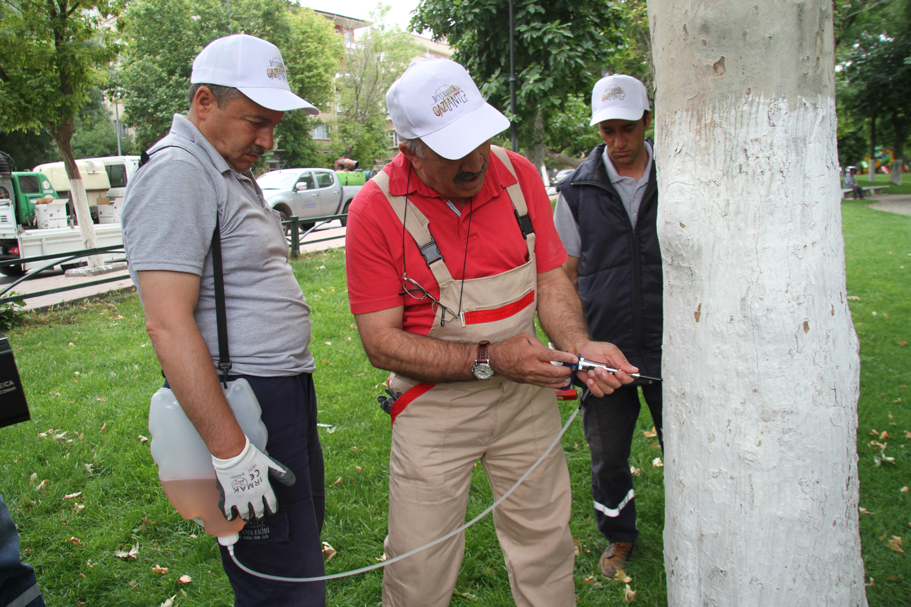 100. yıl parkı içindeki ağaçlara enjeksiyon yolu ile ilaçlamaya başladıklarını ifade eden Akpolat, “Uygulamanın ağaca hiçbir zararı yok. Genel olarak zararlı ve hastalıklı olan ağaçlara yapılıyor. Yaşlısı, genci diye bir ayrım yapılmıyor hepsine yapılıyor. Bu uygulamanın etkisi 2 yıldır. Kontrolümüz altında 2 yıl sonra aynı uygulama tekrar edeceğiz. Bu ilacın ağaca katkısı ağaçtaki zararlıları (bit, yaprak biti, kırmızı örümcek gibi) öldürüyor” şeklinde bilgeler verdi.