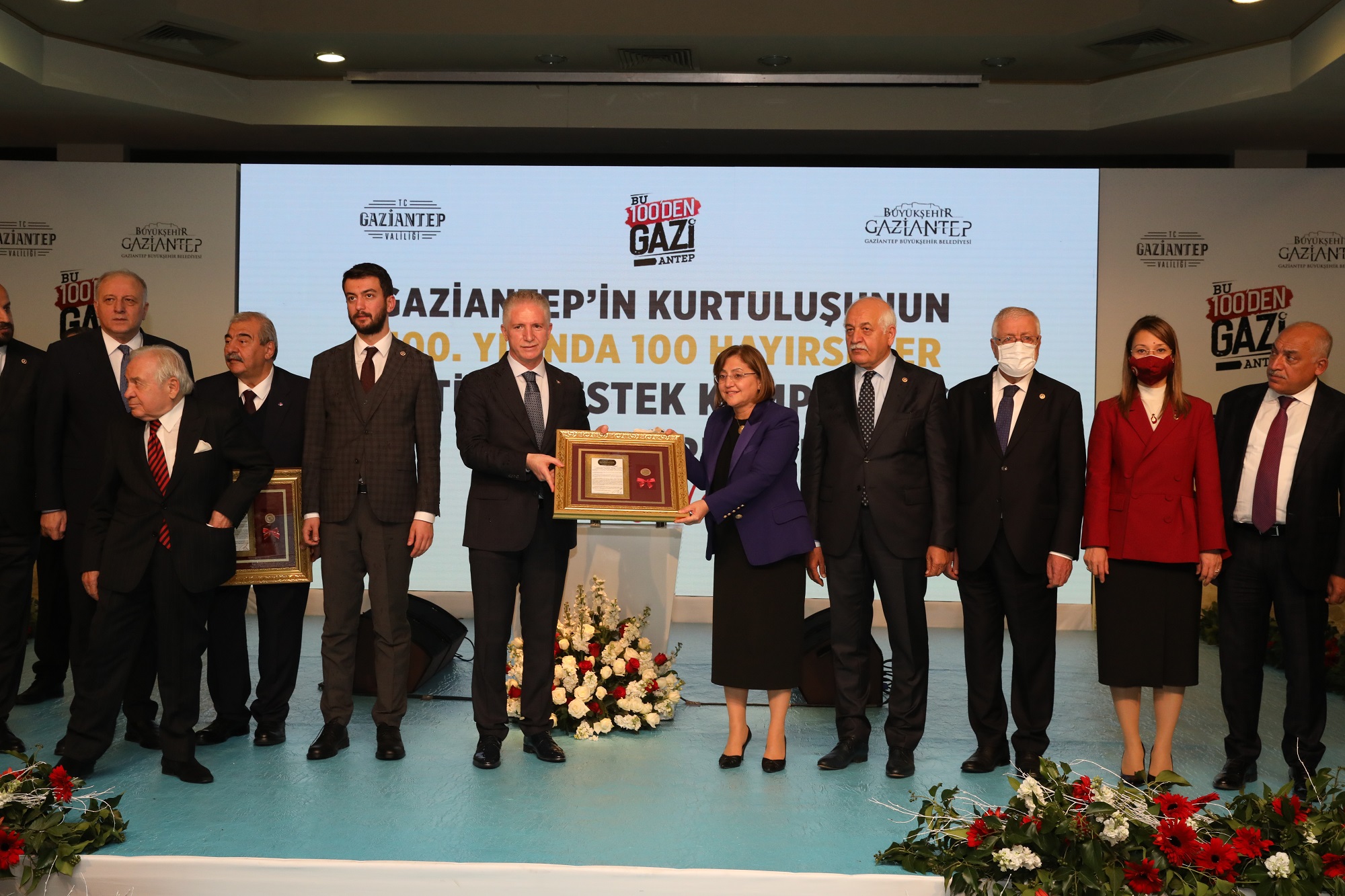 Cumhurbaşkanı Recep Tayyip Erdoğan’ın katılımıyla “Yüzüncü Yılda Yüz Hayırsever” Kampanyası’nın ödül töreni gerçekleşti. Törende konuşma yapan Cumhurbaşkanı Erdoğan Gaziantep Büyükşehir Belediyesi tarafından hayata geçirilen GASMEK, çocuk kütüphaneleri, Kent Arşivi, imar çalışmalarını ile Gazikültür A.Ş.’nin yazılı, görsel faaliyetleri ve Yeşil Şehir” başarısından övgüyle bahsetti.