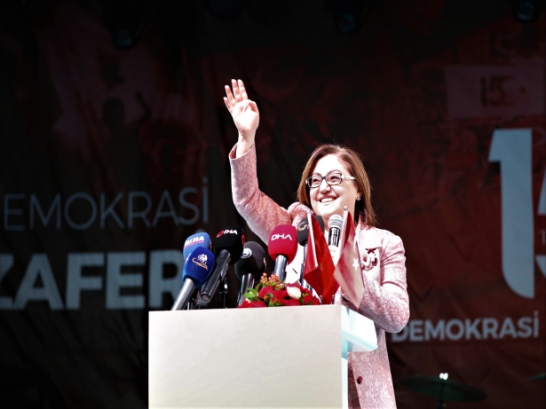 Meydanda toplanan halka seslenen Gaziantep Büyükşehir Belediye Başkanı Fatma Şahin, İstiklal Marşı’nın “Arkadaş! Yurduma alçakları uğratma, sakın. Siper et gövdeni, dursun bu hayasızca akın. Doğacaktır sana va'dettigi günler Hakk'ın... Kim bilir, belki yarın, belki yarından da yakın” kıtasını okuyarak sözlerine başladı.
