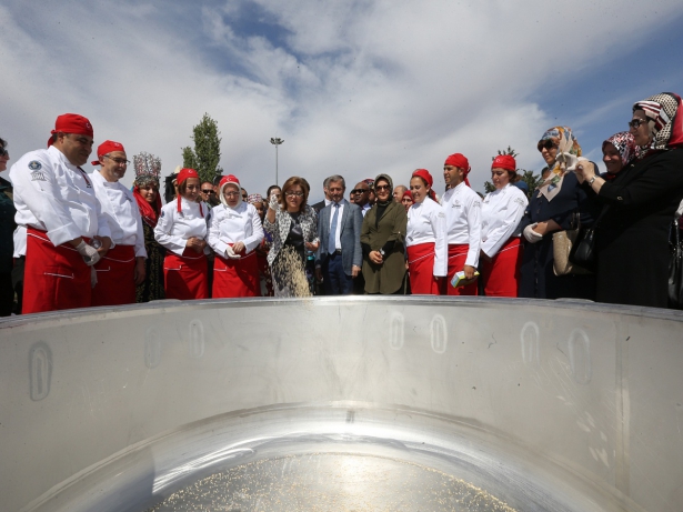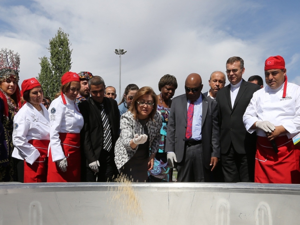 Konuşmaların ardından, malzemelerin ıslatılması için Fatma Şahin, Esmaül Hüsna okunmuş 99 pirinç, mercimek ve buğdayı tencereye dökerken, etkinliğe katılan Demokratik Kongo Cumhuriyeti'nin Ankara Büyükelçisi Marcel Mulumba Tshidimba, Sri Lanka Büyükelçisi Amza Pakeer Mohideen, Vatikan'ın Ankara Büyükelçiliği 1. Müsteşarı Angelo Accattino da kazana birer avuç buğday attı.