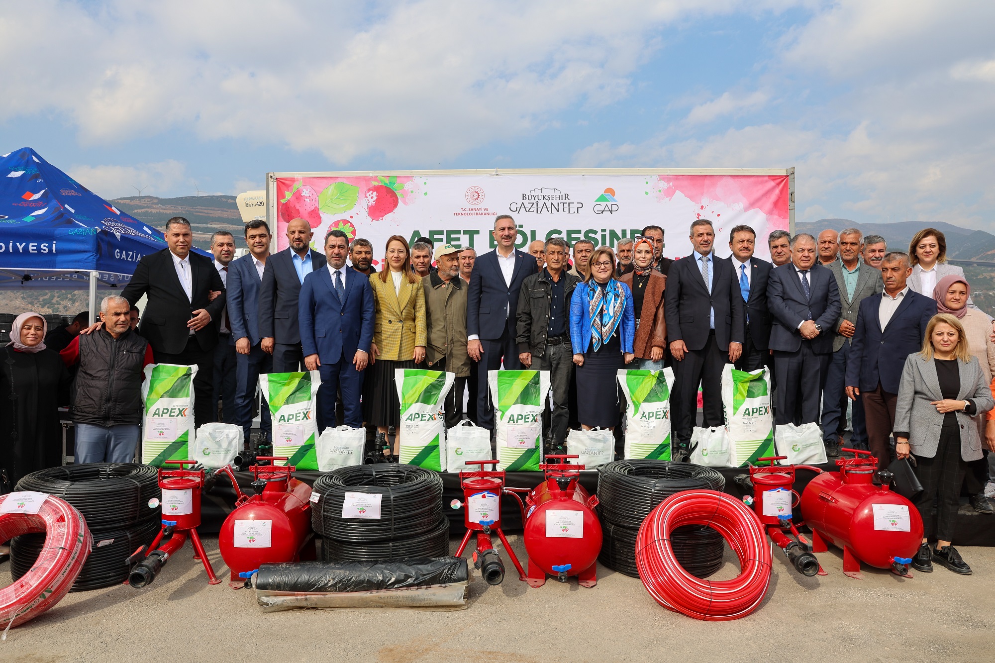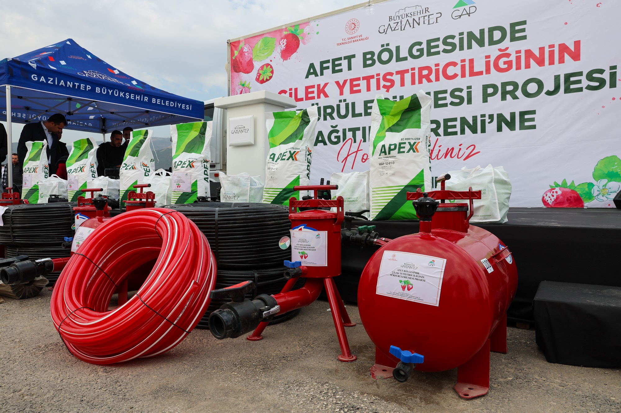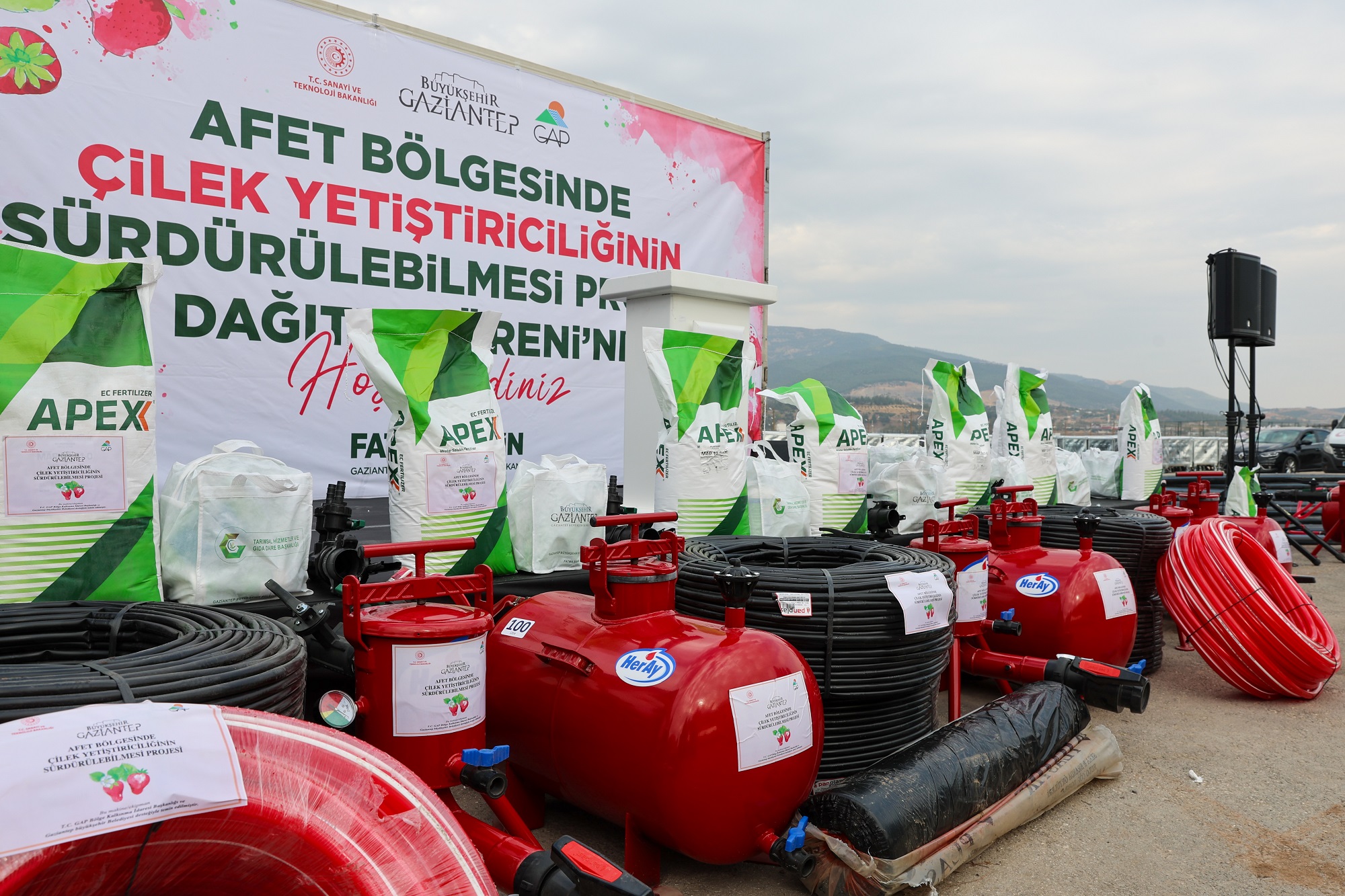 Gaziantep Büyükşehir Belediyesi, depremden ağır hasar alan Nurdağı ve İslahiye’de çilek üretimini sağlamak ve sürdürülebilirlik oluşturmak amacıyla 200 çiftçiye çilek fidesi, gübre, ilaç ve malç temini ile damlama sulama sistemi düzenlenen törenle dağıtıldı.