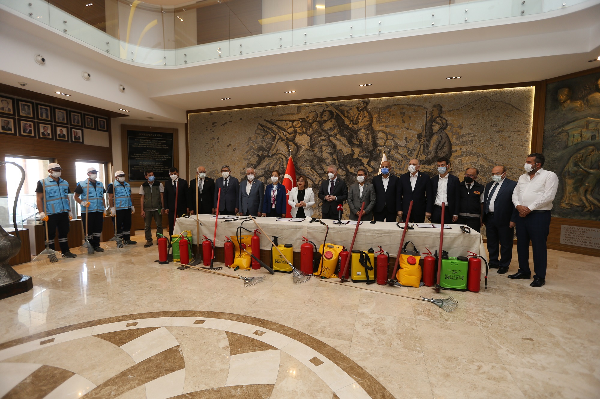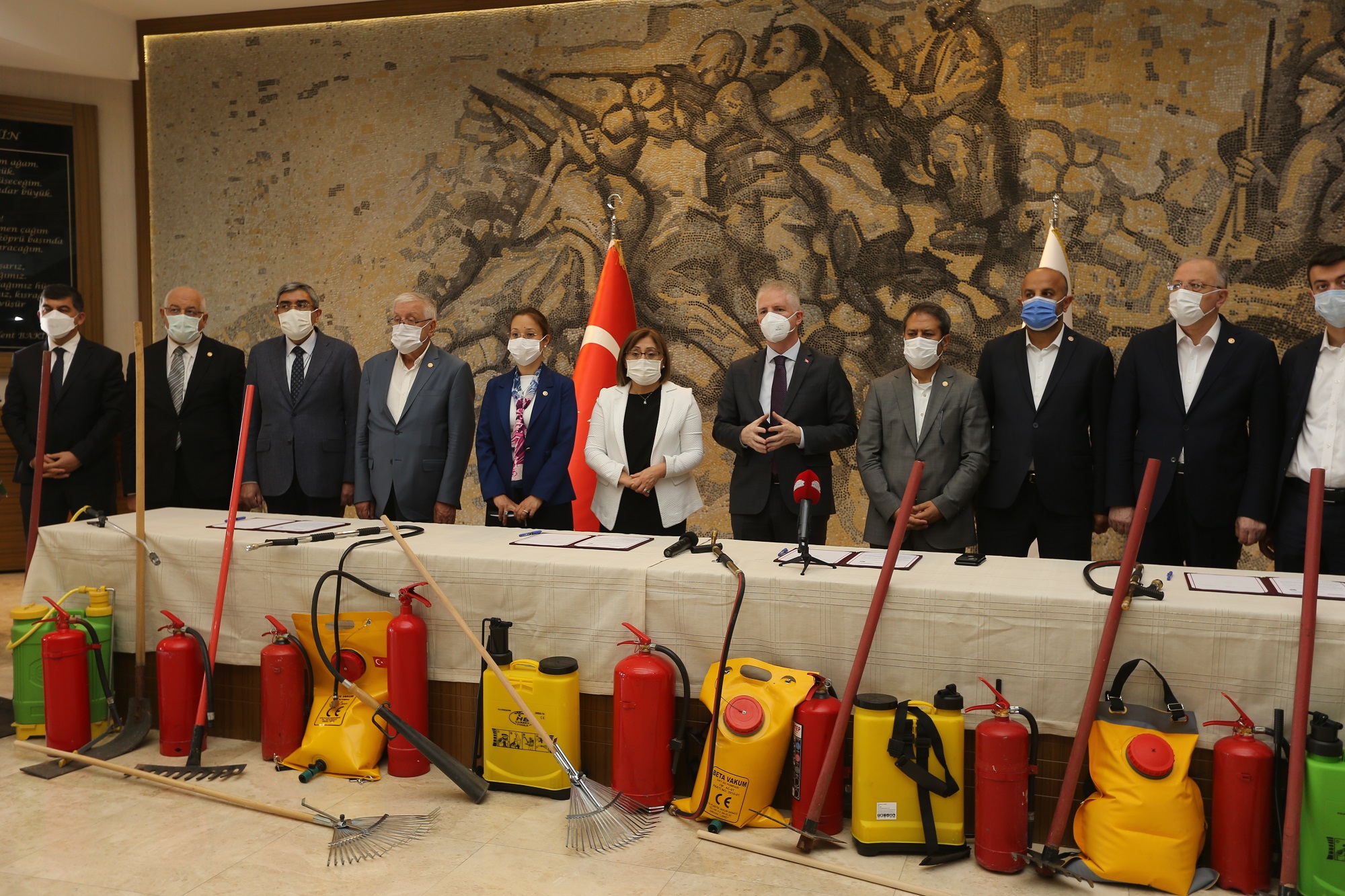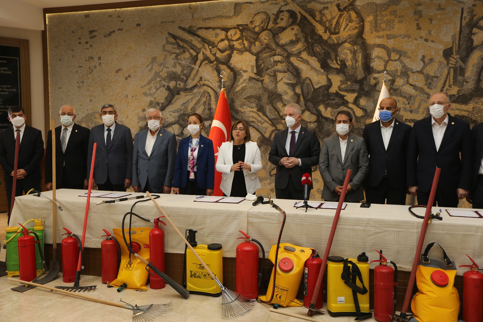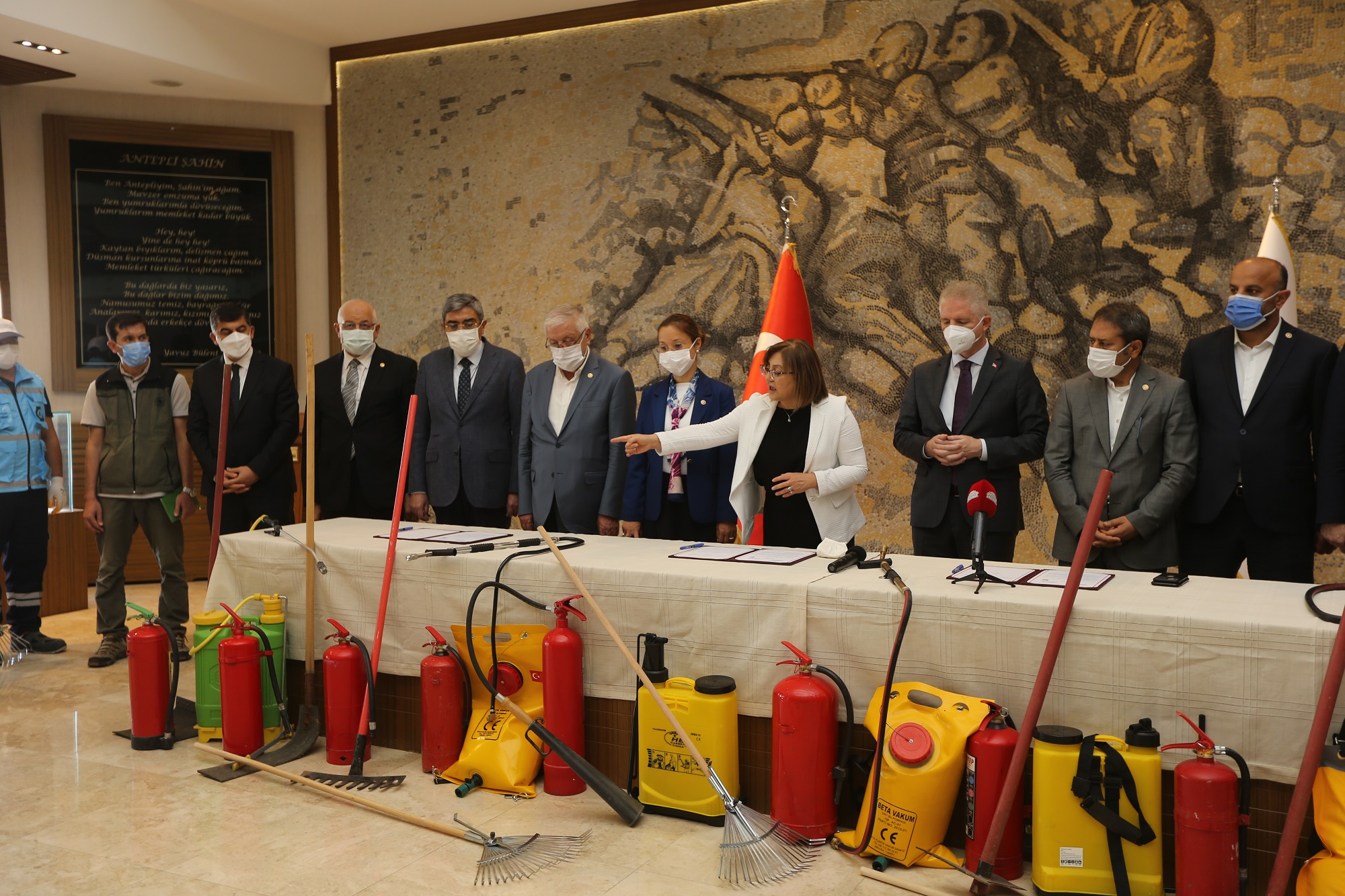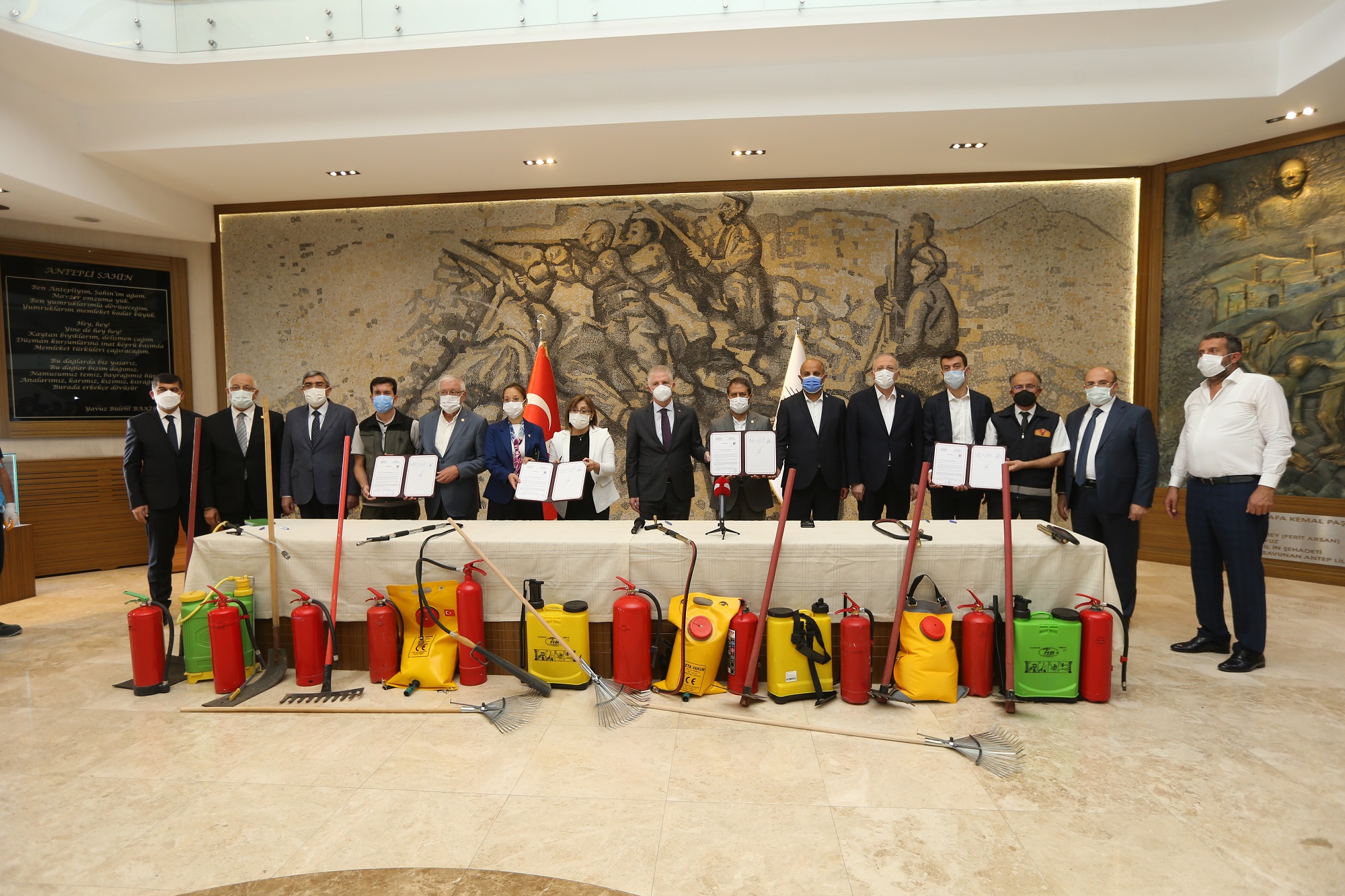 Yangın tehlikesini azaltmak için malzeme yardımı yapmak, toplumsal bilinci yükseltmek ve vatandaşa yangın olaylarına yönelik eğitim vermek amacıyla Gaziantep Büyükşehir Belediyesi, Gaziantep Valiliği, Gaziantep Orman İşletme Müdürlüğü iş birliğinde protokol imza töreni gerçekleştirildi. Törende açıklamada bulunan Başkan Fatma Şahin, dağıtımı yapılacak malzemelerle yangında erken müdahalenin hızlı bir şekilde gerçekleşebileceğini belirterek, “Malzemelerin içerisinde hızlı müdahalede önemli taşınabilir su pompaları, şaplak ve tırmıklar bulunacak. Ayrıca yangında ilk müdahalenin nasıl olacağı konusunda muhtarlar ile köy halkına eğitimler verilecek” diye konuştu.