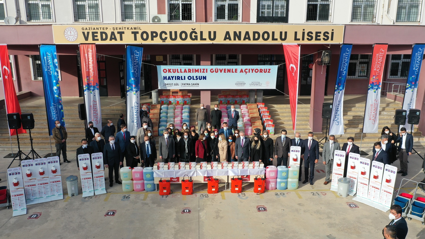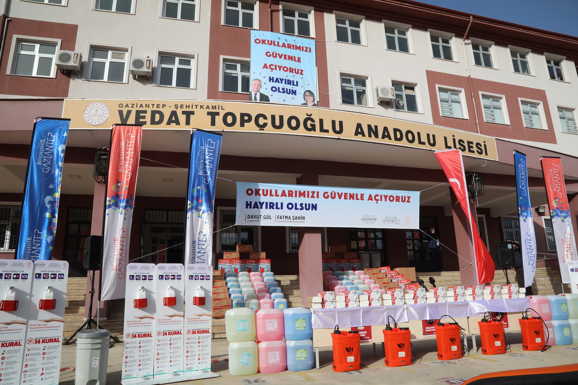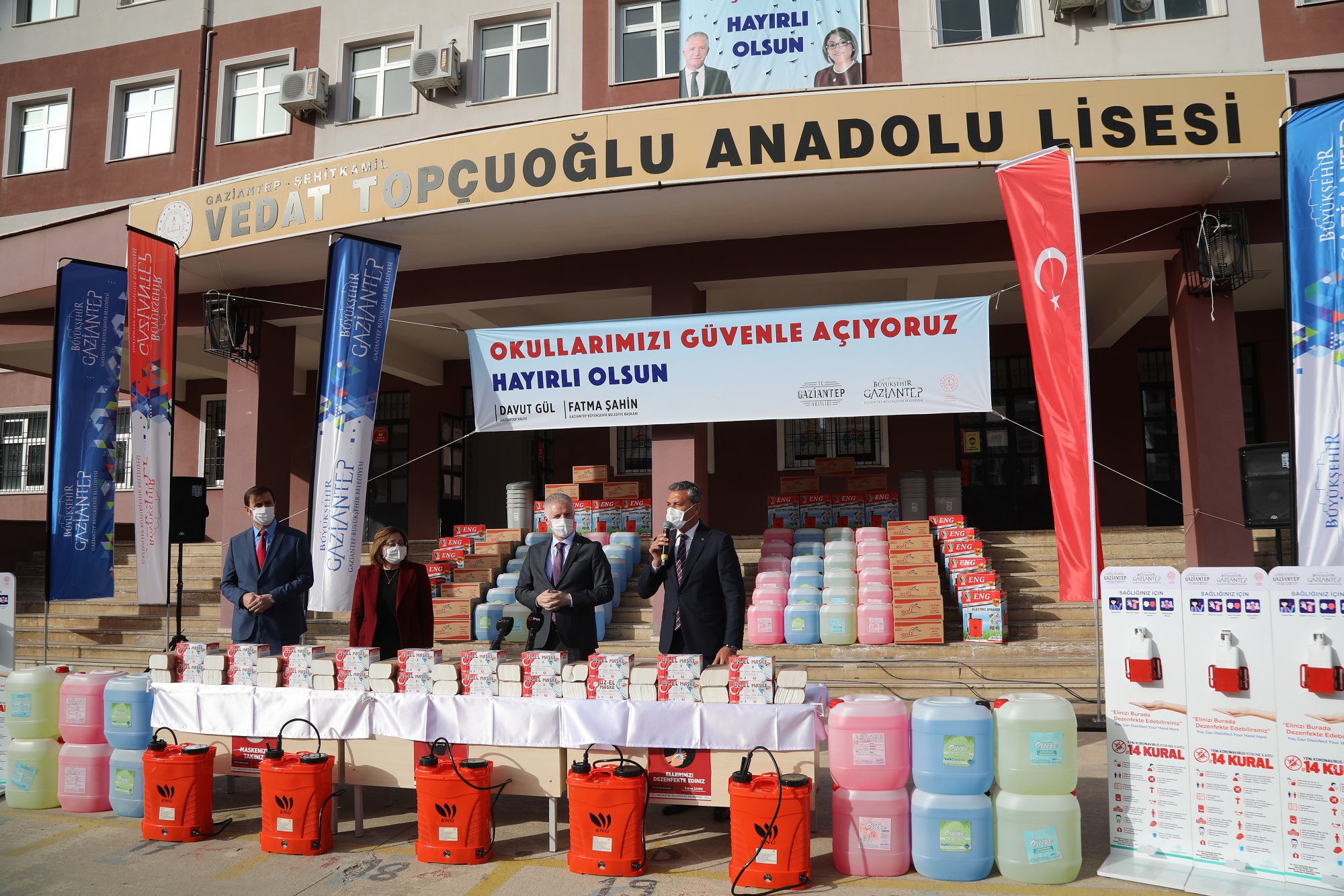 Okulların açılmasıyla ilgili bir dizi hazırlık yapılması gerektiğini aktaran Gaziantep İl Milli Eğitim Müdürü Yasin Tepe, “Bu hazırlıkları da sizinle paylaşmaya geldik. Çünkü velilerimiz de çocuklarımız da belki birtakım endişeler vardır. Umarım bu programımızla da bütün endişeleri ortadan kaldırmayı düşünüyoruz.  Eylül ayında okullar açılmadan önce Gaziantep Valisi Davut Gül, Gaziantep Büyükşehir Belediye Başkanı Fatma Şahin, okulların hazırlığıyla ilgili bütün malzemeleri karşılayacaklarını ifade etmişlerdi. Biz de bu doğrultuda hazırlık içerisine girdik. 22 kademede bütün okullarımızın malzemelerinin sağlanmasını, kullanıma sunulması için bir çalışmamız oldu. Bu 22 kalemden kısaca bahsetmek istiyorum. Elektronik ateş ölçerler, sıvı sabunlar, yer dezenfektanı, el dezenfektanı, yüzey temizleyiciler, sosyal mesafe stickerları, sosyal mesafe kurallarının anlatıldığı 14 kural levhaları, El yıkama bilgilendirme afişleri, doğru maske kullanımı afişleri, kağıt havlu, peçete, maskeler ayrıca bunların bütün elektronik aparatları, Çöp kovaları, tıbbi atıklar, elektronik pompalar… Bin 157 okulun tamamına bu malzemeler 1 yılın tamamını kapsayacak şekilde temin edildi. Bu program vesilesiyle Başkanımız Fatma Şahin’e ve Vali Davut Gül’e şükranlarımız arz ediyorum” dedi.