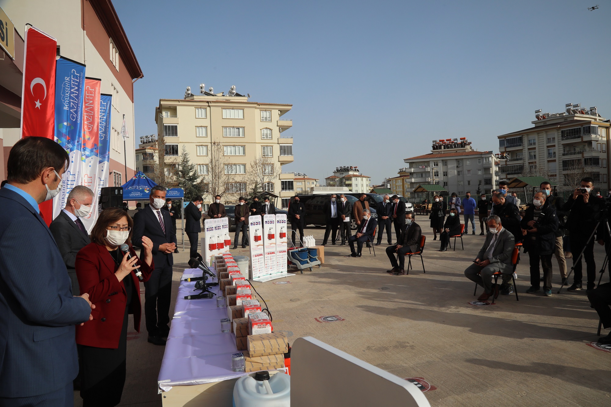 Dünya’yı ve Türkiye’yi kısa sürede etkisi altına alan yeni tip Koronavirüs (Kovid-19) Salgını çerçevesinde birlikte iş yapma modeli olarak görülen Gaziantep Modeli ile il sınırları içerisinde bulunan bütün okullar için Gaziantep Büyükşehir Belediyesi, Gaziantep Valiliği koordinatörlüğünde Gaziantep İl Milli Eğitim Müdürlüğü’yle ortaklaşa hareket ederek 1 Mart’tan itibaren kademeli olarak açılacak okulların maske, temizlik malzemesi ve tedbirlerin içinde bulunduğu ihtiyaçlarını “Okullarımızı güvenle açıyoruz” sloganıyla tamamlandı. Okullarda Koronavirüs bulaş riskinin azaltılmasının hedeflendiği çalışmada Büyükşehir Belediyesi, 6 milyon TL’lik bütçe ayırarak okulların bu konuda bütün ihtiyaçlarını giderdi. Şehitkamil İlçesi Vedat Topçuoğlu’nda düzenlenen tanıtım toplantısında Büyükşehir Belediyesi tarafından şehirde bulunan bin 157 okulun temizlenerek 10 bin litre yüzey dezenfektanı, 75 bin litre sıvı el sabunu, 410 bin yıkanabilir maske, 2 bin adet el dezenfektan standı, 50 bin adet yer stickerı, 500 adet klozetör akülü dezenfektan sıkma makinesinden oluşan malzemeleri temin etti. Malzemeler okulların bir yıllık temizlik ihtiyaçlarını karşılayacak şekilde ayarlandı. Tanıtıma Gaziantep Valisi Davut Gül, Gaziantep Büyükşehir Belediye Başkanı Fatma Şahin, Gaziantep İl Milli Eğitim Müdürü Yasin Tepe ve okul müdürleri katıldı.