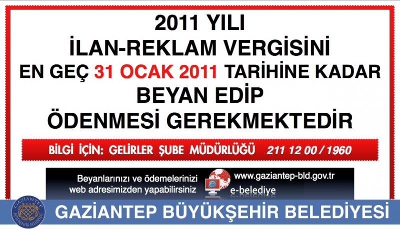 Gaziantep Büyükşehir Belediyesi Mali Hizmetler Daire Başkanlığından yapılan açıklamada Büyükşehir Belediyesi sınırları ile mücavir alanları içinde, 5216 sayılı Büyükşehir Belediyesi Kanununun 7/G maddesinin Büyükşehir yetki ve sorumluluk alanlarında bulunan cadde, bulvar, meydan gibi yerlerde yapılan her türlü ilan ve reklamın İlan Reklam vergisine tabi olduğunu belirtildi.