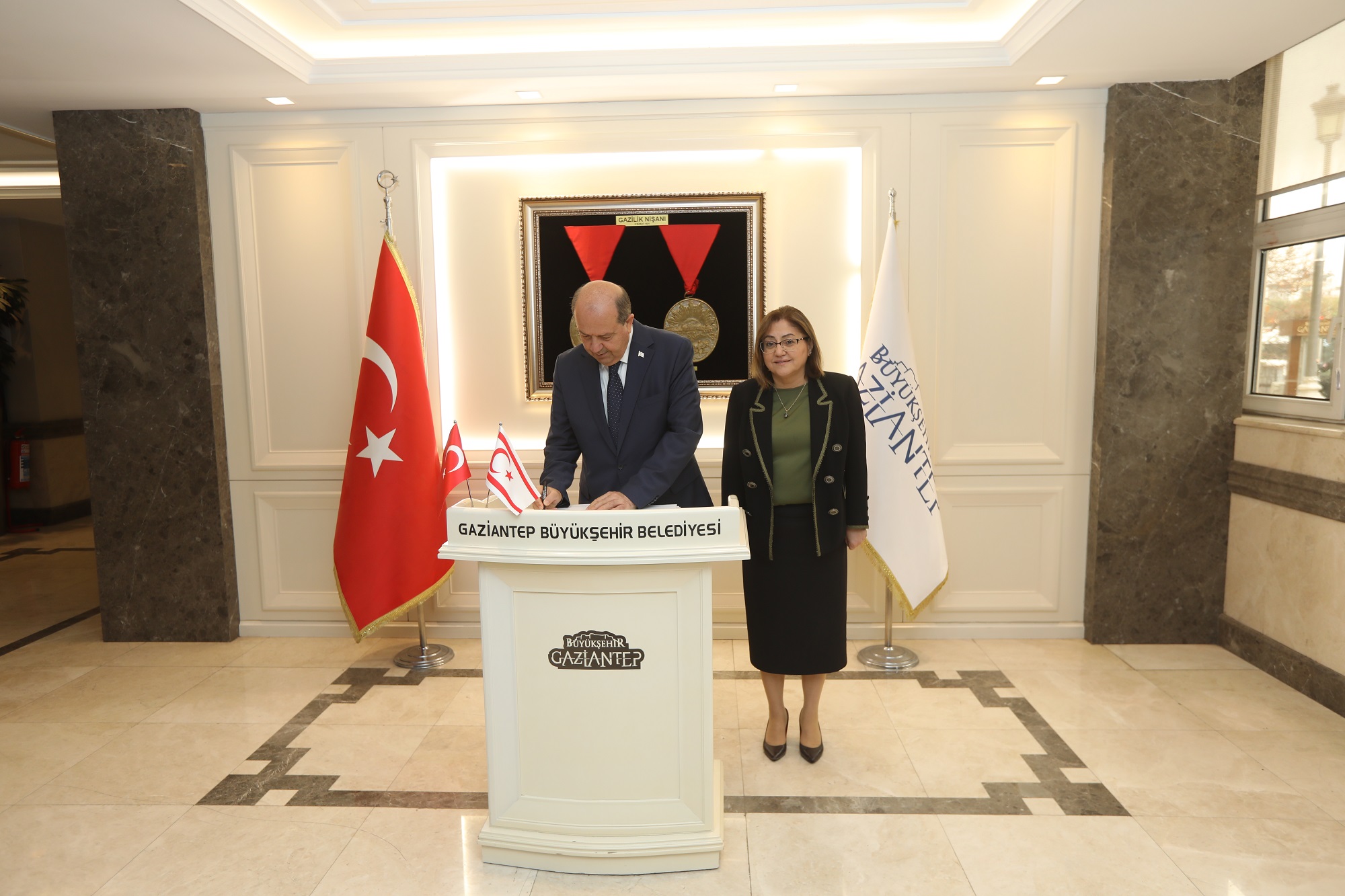 Çeşitli temaslarda bulunmak için Gaziantep’e gelen KKTC Cumhurbaşkanı Ersin Tatar, Gaziantep Büyükşehir Belediye Başkanı Fatma Şahin’i makamında ziyaret ederek şeref defterini imzaladı.