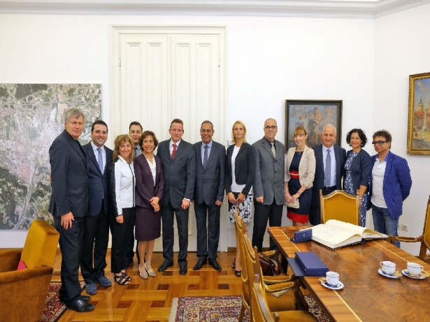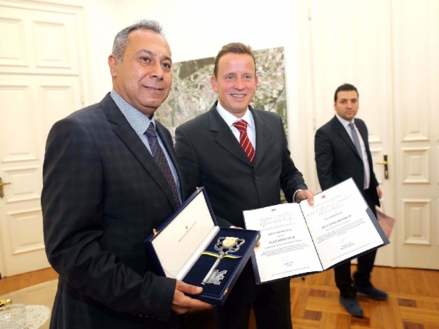Celje Belediye Başkanı Bojan Srot, Gaziantep Büyükşehir Belediye Başkanı Fatma Şahin'e verilmek üzere Celje şehrinin temsili anahtarını Gaziantep heyetine teslim etti.