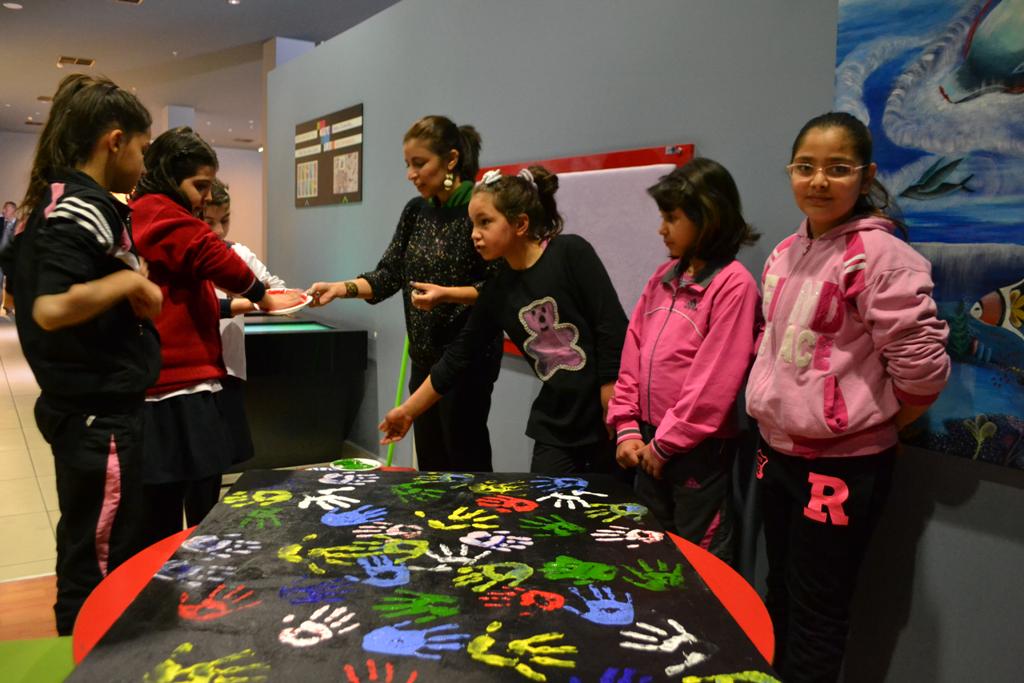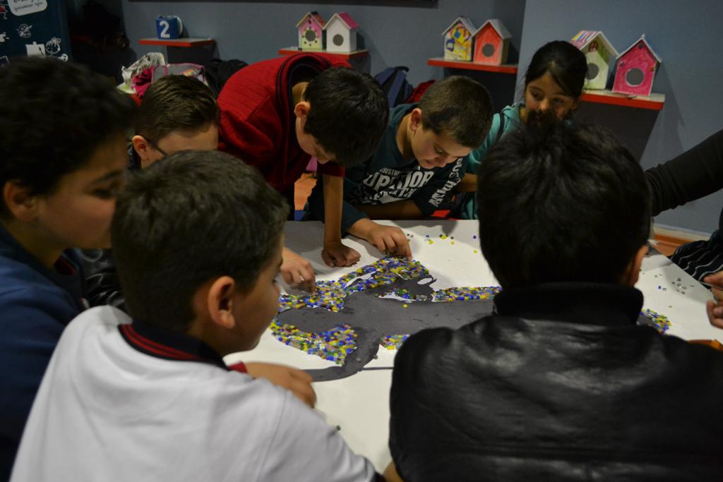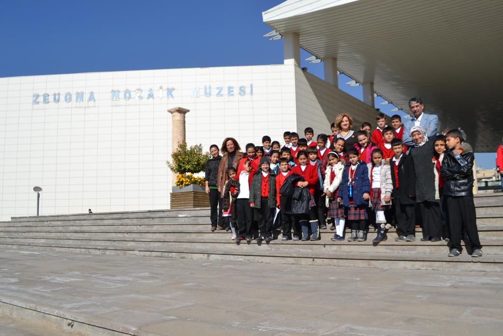 Gaziantep’teki çeşitli okullardan yaklaşık 175 öğrencinin katıldığı atölye çalışmasında minikler ilk defa mozaik yaptı. Çocuklarında yer aldığı atölye etkinliğinde, 110 ve 100 cm boyutunda iki tuval üzerine cam mozaik taşları ile Mars Heykeli, doğal taşlarla Antepfıstığı ağacı ve el izi mozaik çalışması tamamlandı.