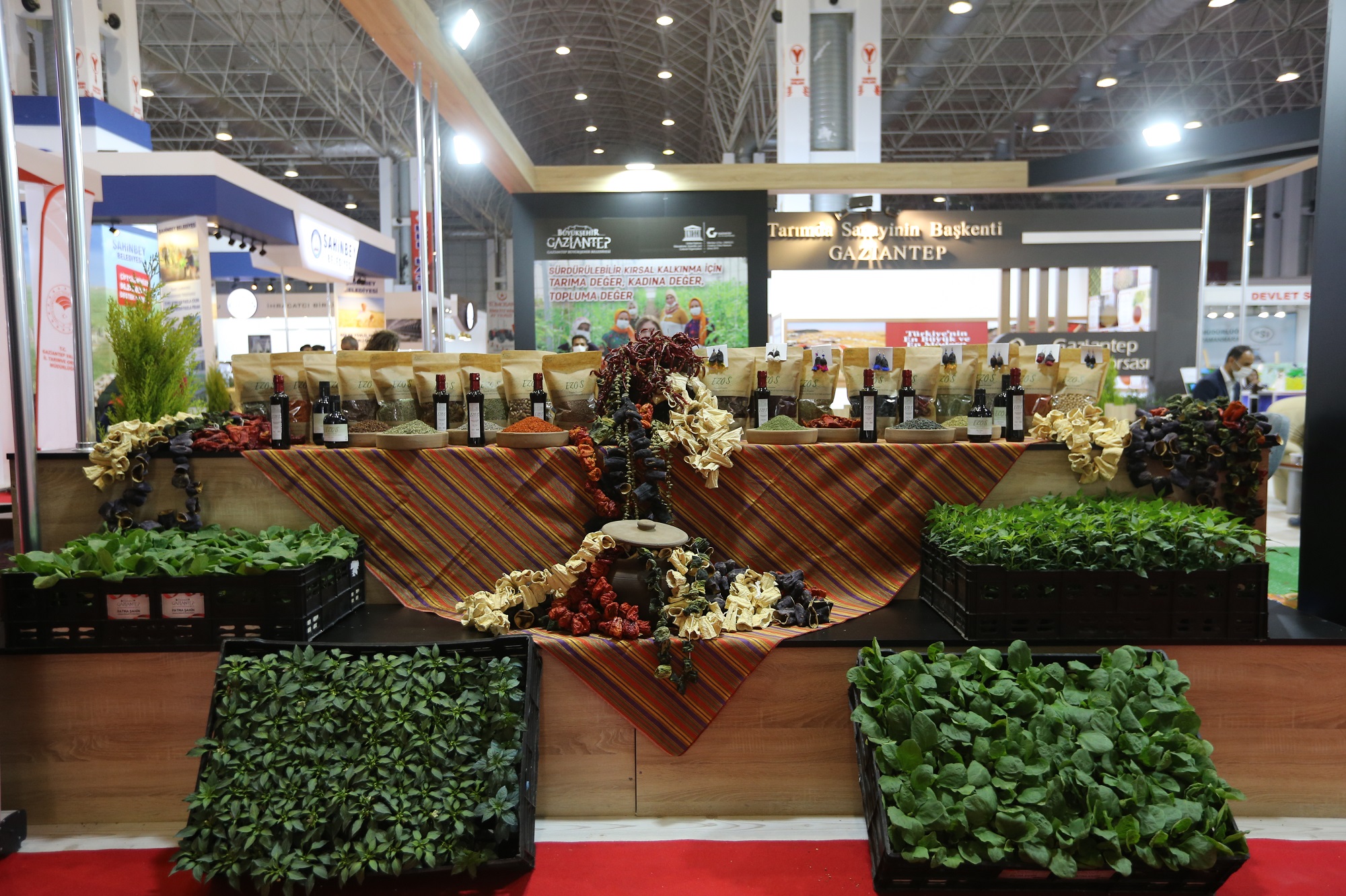 Büyükşehir Belediyesi Tarımsal Hizmetler ve Gıda Daire Başkanlığı tarafından, Ortadoğu Fuar Merkezi’nde düzenlenen 12’inci GAPTARIM, Tarım Teknolojileri ve Hayvancılık Fuarı’nda kurulan stant büyük ilgi topladı. Yürütülen projelerin örneklerinin bulunduğu stantta, yerel ürünler sergilendi, Büyükşehir Belediyesi’nin projeli tarımsal destekleri, yürütülmekte olan projeler, üretime destek sağlayacak dağıtımlar ve diğer tarımsal faaliyetleri hakkında bilgilendirmeler yapıldı, doğru ve verimli tarım için danışmanlık verildi. Stantta ayrıca oluşturulan doğal alanda bol bol hatıra fotoğrafı çekildi. Öte yandan Gaziantep Büyükşehir Belediyesi’nin destekleriyle kadınların örgütlenerek kurduğu Ezogelin Tarım Kooperatifi üyeleri, ürettiği ürünleri çiftçilerle paylaştı, kadın üreticilere deneyimlerini aktarırlarken, merak edilen soruları yanıtladılar.