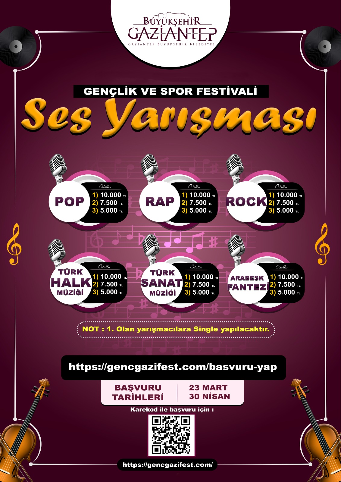 Gaziantep Büyükşehir Belediyesi (GBB) tarafından “Gençlik ve Spor Festivali” kapsamında Türkiye genelinde ses yarışması düzenleniyor. Performansıyla derece alan isimleri “single” albüm başta olmak üzere çeşitli para ödülleri bekliyor.