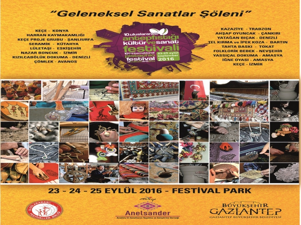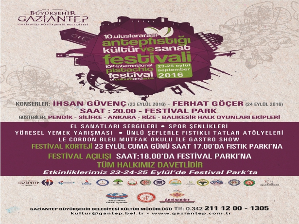 Bu arada 10.Uluslararası Antepfıstığı Kültür Ve Sanat Festivali çerçevesinde düzenlenecek, “Geleneksel Sanatlar Şöleni” sergisinde Gaziantep’in yanı sıra Konya, Şanlıurfa, Kütahya, Eskişehir, İzmir, Denizli, Avanos, Trabzon, Çankırı, Denizli, Bartın, Tokat Nevşehir ve Amasya kendi yörelerine ait ürünleri sergileyecek.