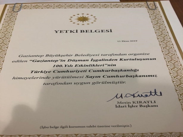 Büyükşehir Belediye Başkanı Fatma Şahin, Gaziantep Valisi Davut Gül, Gaziantep milletvekilleri, Şahinbey Belediyesi, Şehitkamil Belediyesi, oda başkanları ve sivil toplum kuruluş temsilcilerinin girişimleri sonucunda Cumhurbaşkanlığı, Antep’in düşman işgalinden kurtuluşunun 100’üncü yılına özel karar aldı. Gaziantep, topyekûn yürüttüğü çalışmanın meyvesini topladı, büyük bir coşkuyla kutlanan 25 Aralık Antep’in kurtuluş etkinliklerini Cumhurbaşkanlığı’nın himayesine taşımayı başardı. Başkent Ankara’da, Gaziantep Büyükşehir Belediyesi Basın Yayın ve Halkla İlişkiler Daire Başkanı Ahmet Recep Tekcan’la Kültür ve Turizm Daire Başkanı Oya Alpay, Türkiye Cumhuriyeti Cumhurbaşkanlığı İdari İşler Başkanı Metin Kıratlı’nın elinden yetki belgesini aldı.