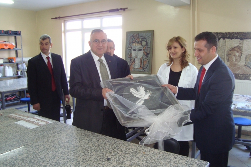 Mozaik sınıfını gezen Başkan Güzelbeye kurs hocası ve kursiyerler tarafından yapılan mozaik tablo hediye edildi.