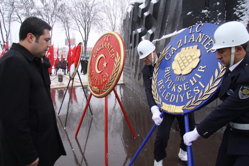 Demokrasi Meydanı'nda Atatürk Anıtı'na çelenk konulmasıyla başlayan törene Gaziantep Valisi Erdal Ata, 5. Zırhlı Tugay Komutanı Tuğgeneral Kahraman Güneş, Büyükşehir Belediye Başkan Vekili Selami Yetkinşekerci, Cumhuriyet Başsavcı Mustafa Peker, Atatürk Anıtı'na çelenk bıraktı.