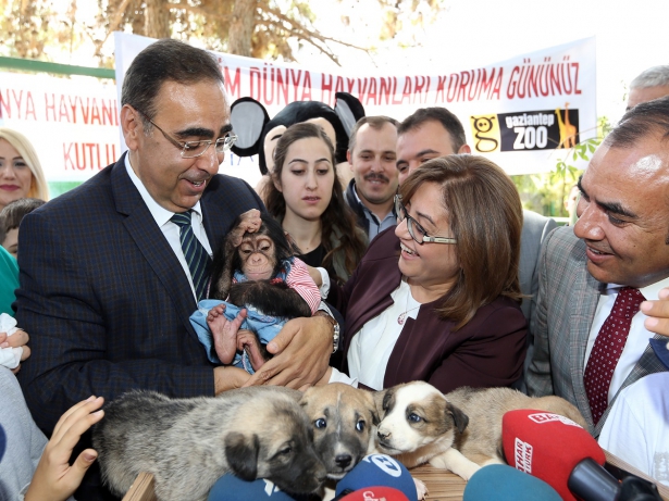 Bir grup öğrencilerin de katıldığı etkinlikte, Başkan Şahin ve öğrenciler köpek ile şempanze yavrusuyla birlikte basın mensuplarına poz verdi.